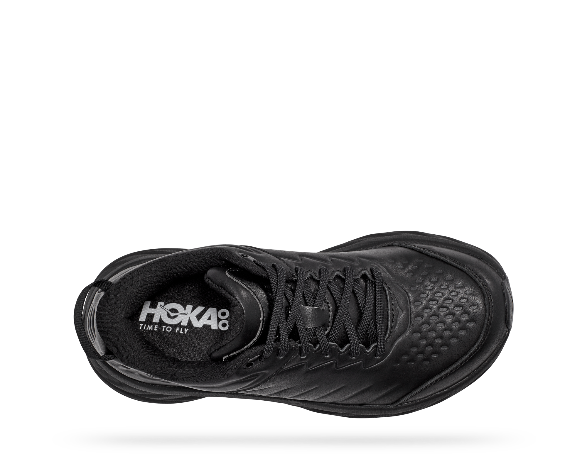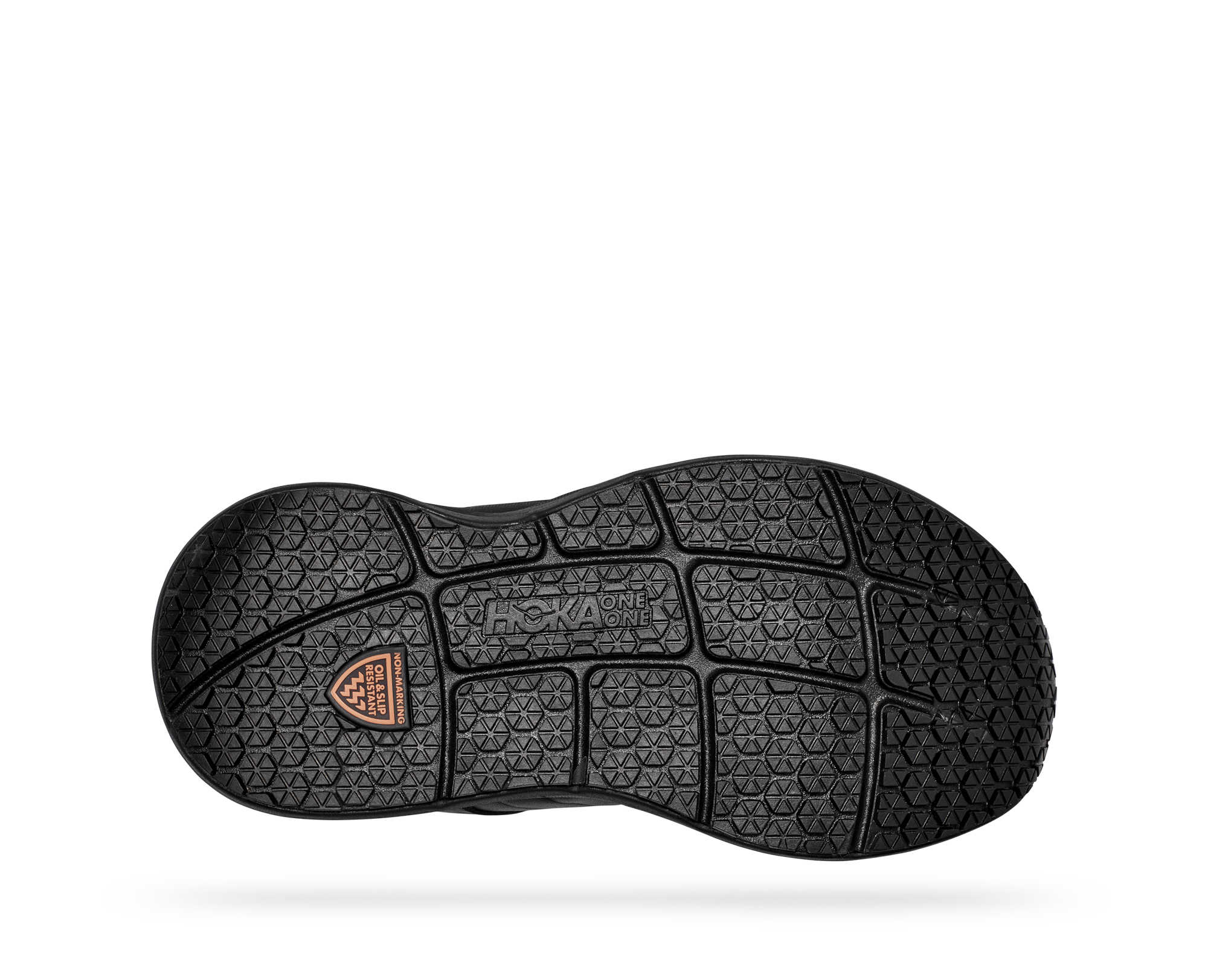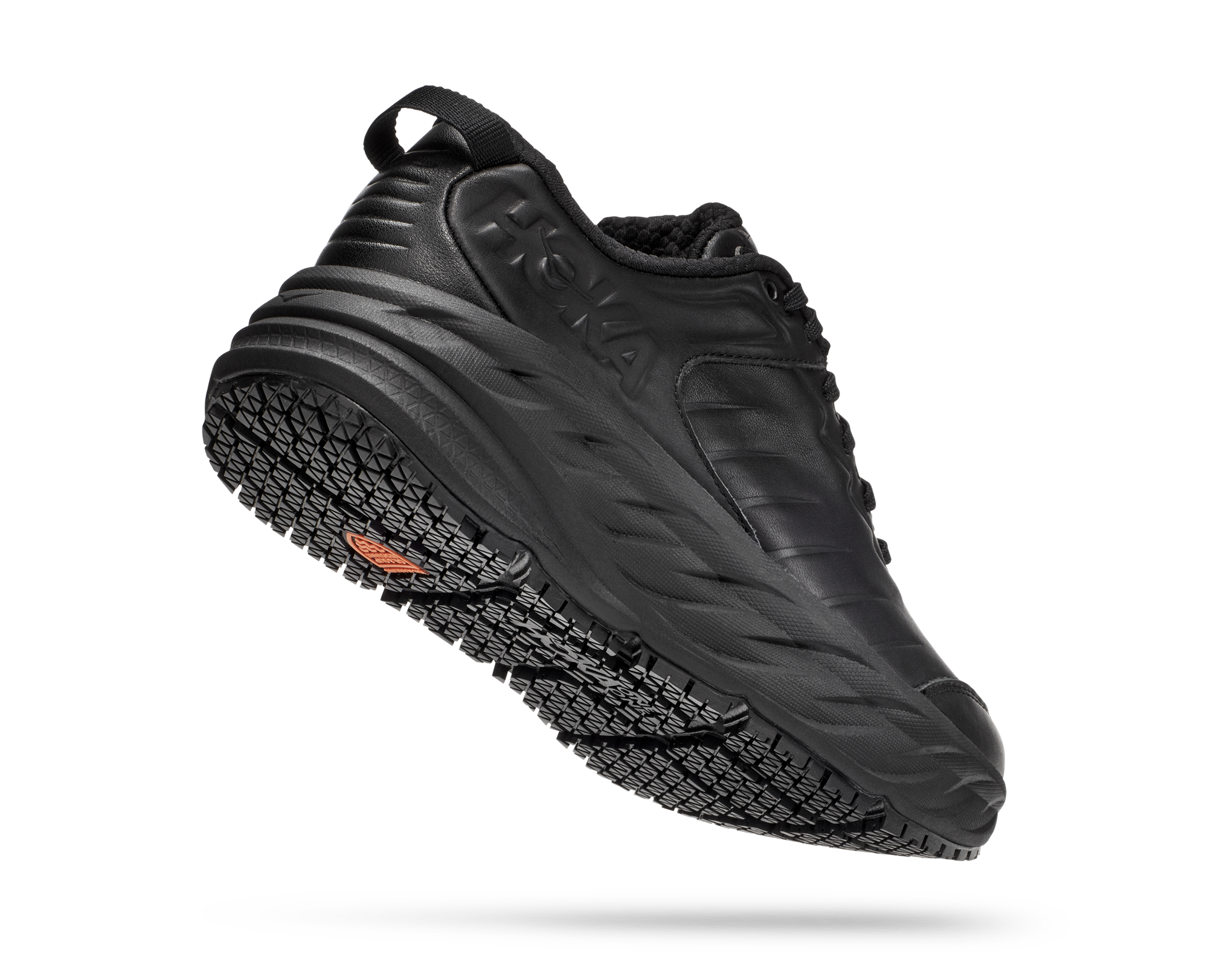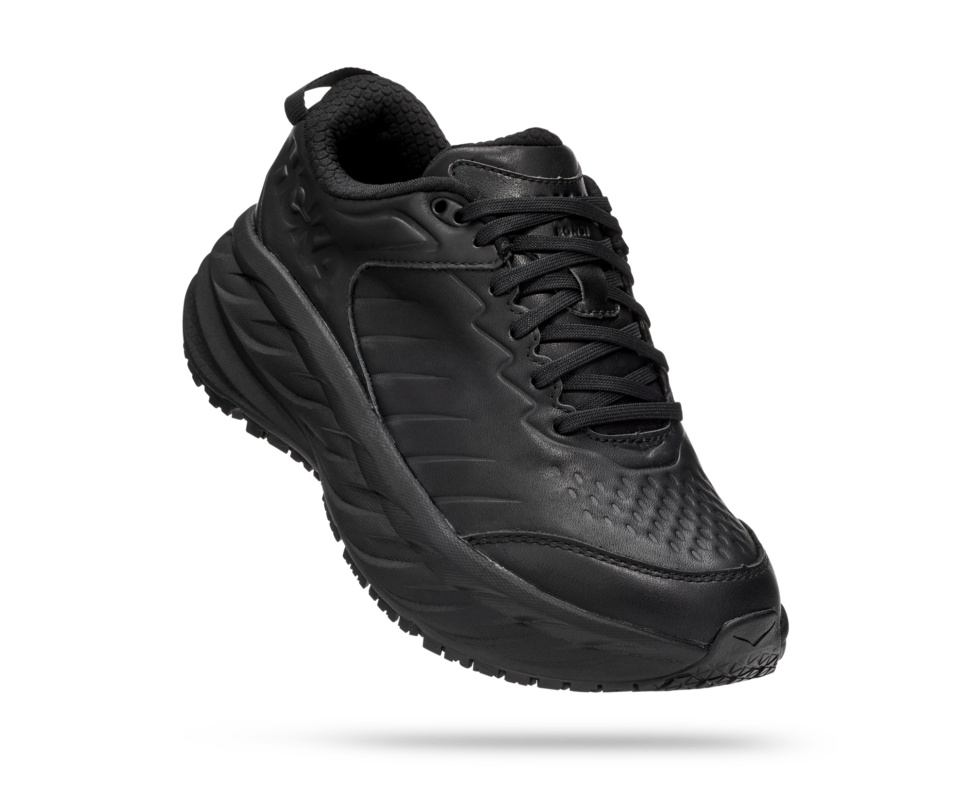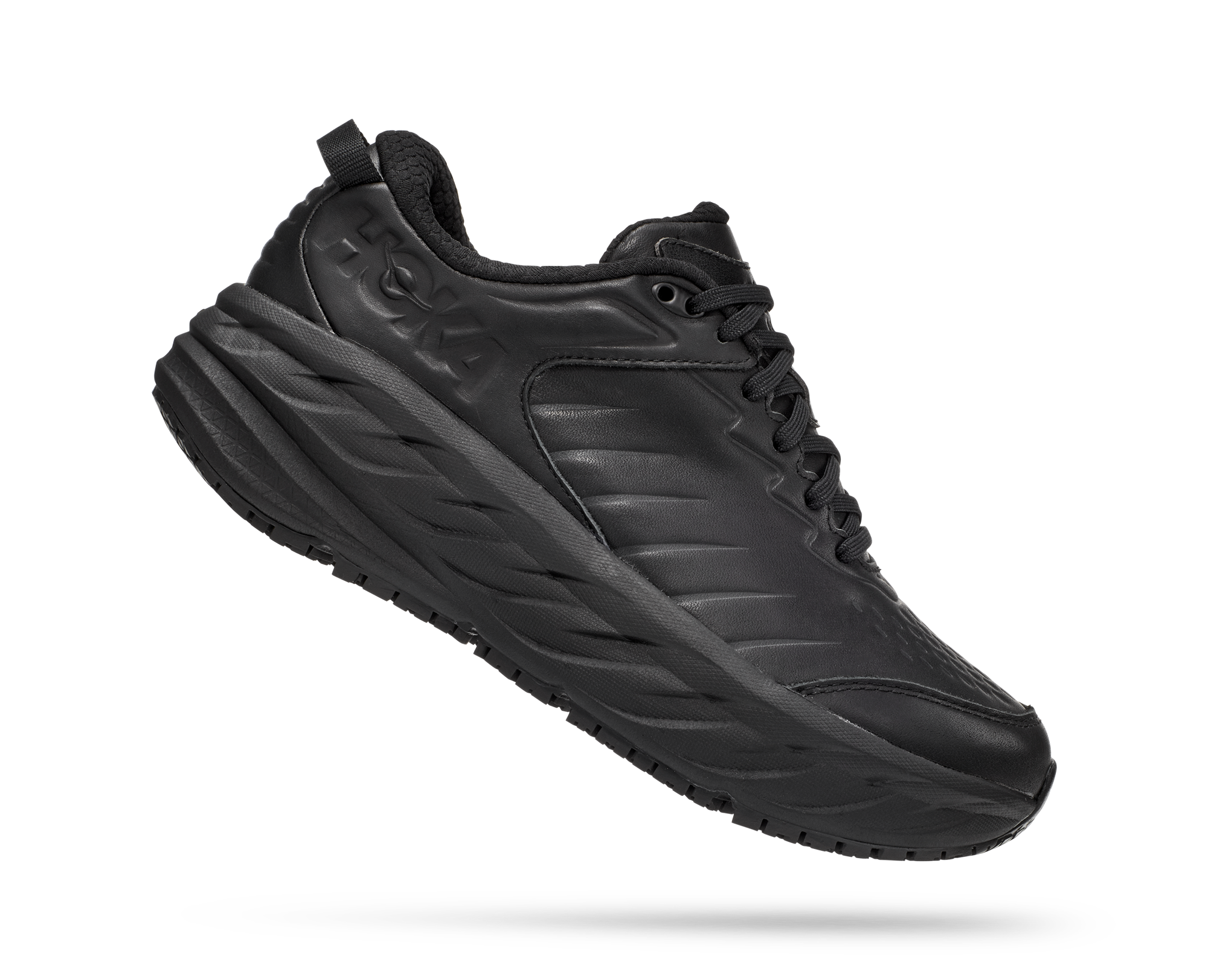 One of the first line extensions of the beloved Bondi family, the new Bondi SR takes the most cushioned shoe in the HOKA road-shoe lineup and reworks the silhouette to handle the demands of daily life. Engineered with an EVA midsole for plush, all-day cushioning, this workplace warrior has been updated with water-resistant leather and a slip-resistant outsole. Boasting a proprietary outsole compound tested against industry standards, the Bondi SR features an ultra-grippy, full ground contact rubber that stands up to the service industry and medical field alike.