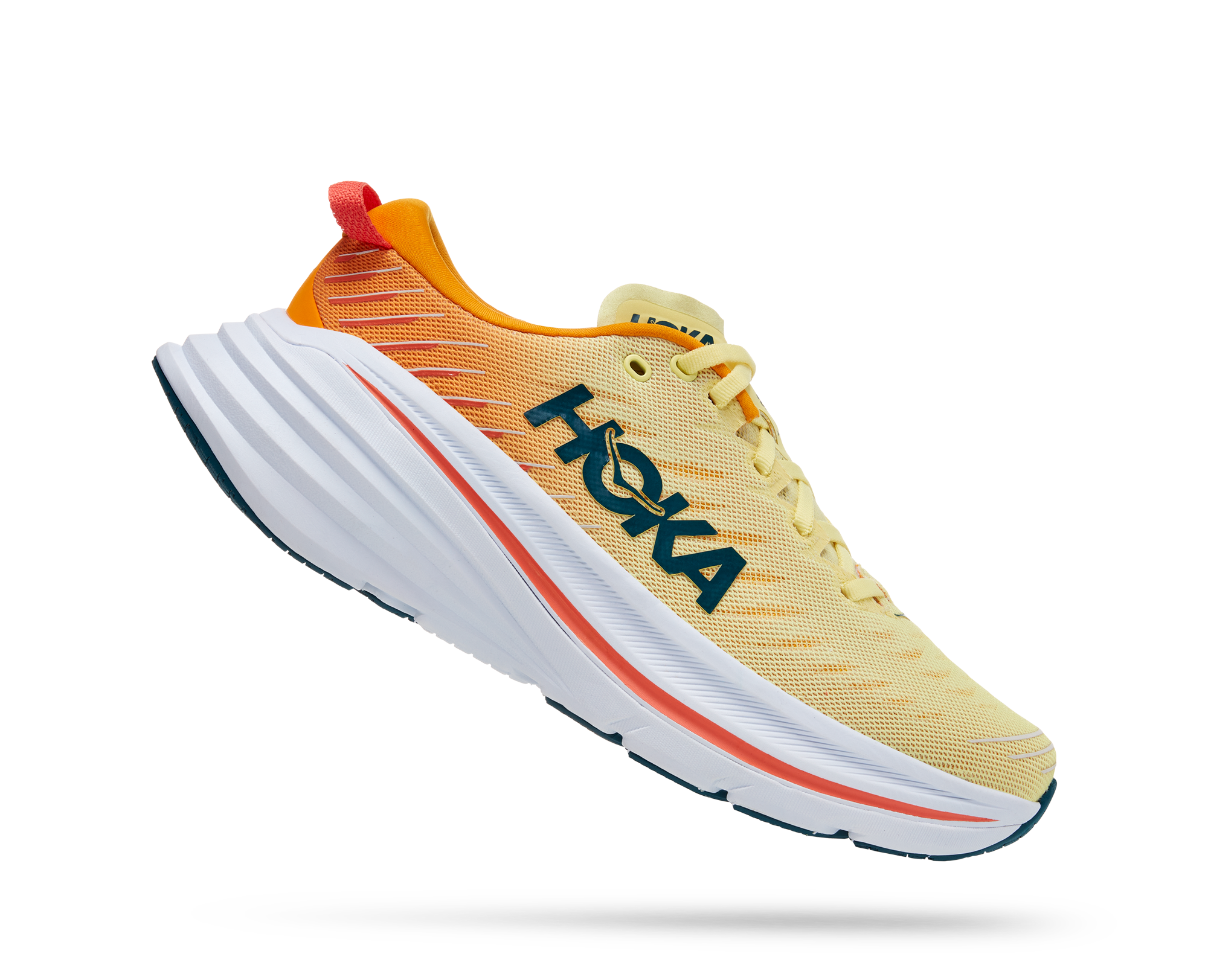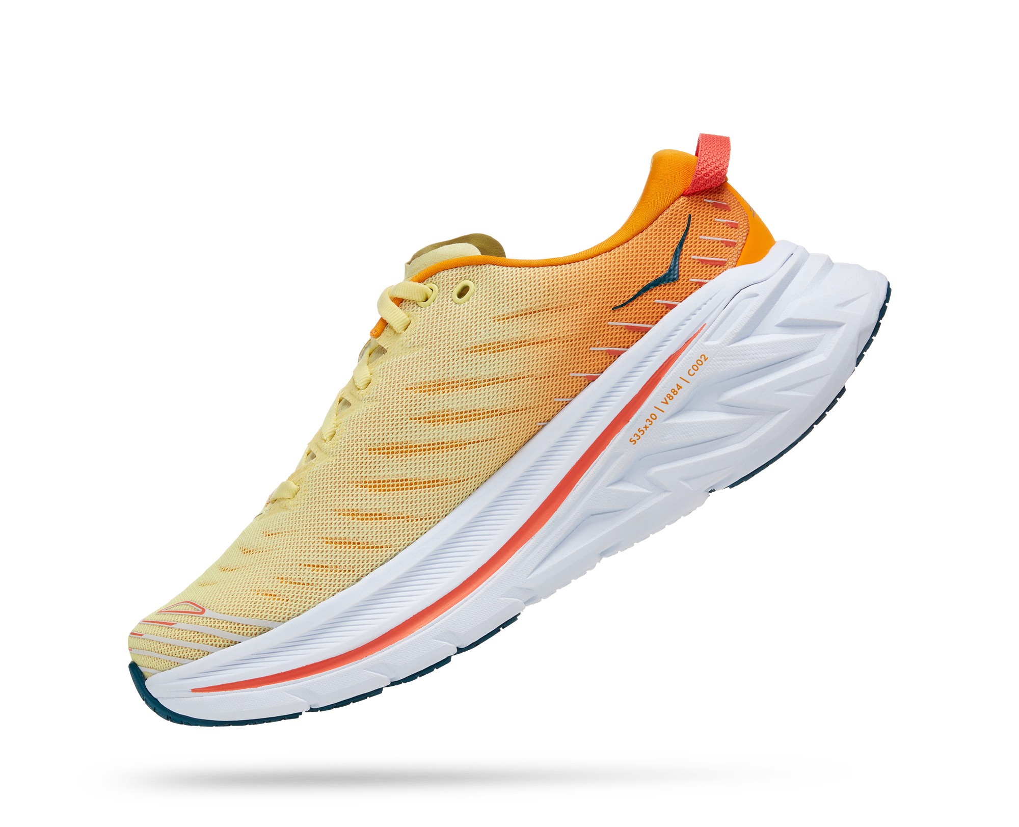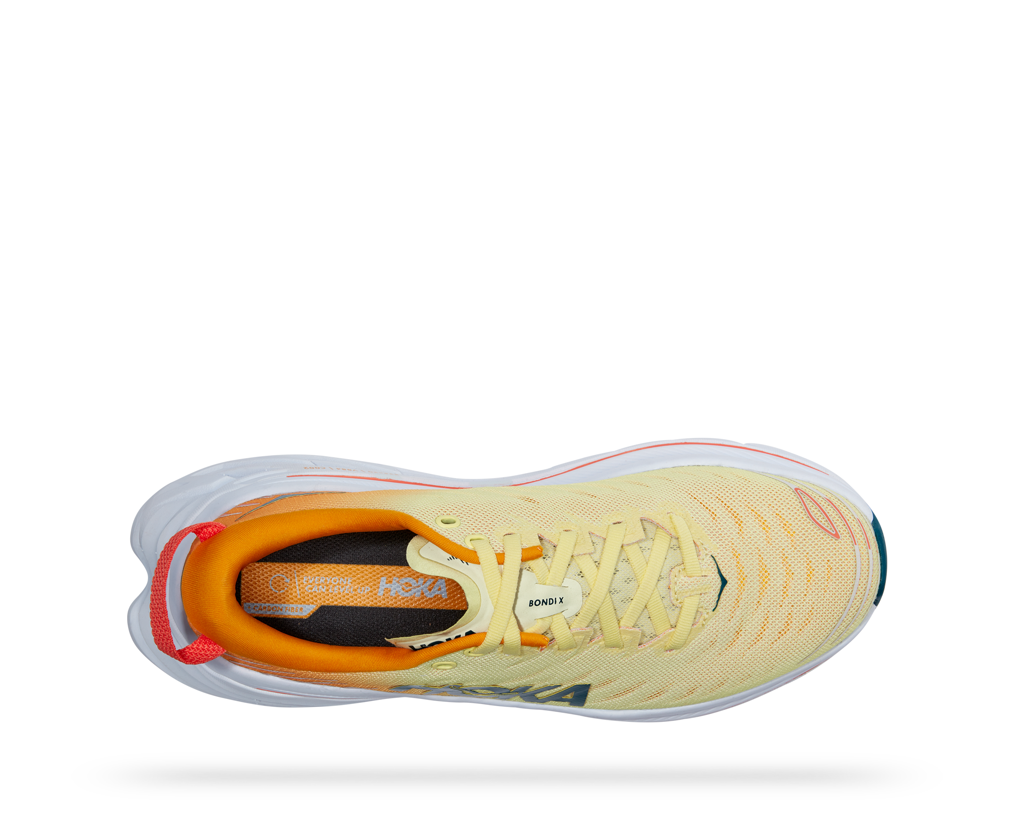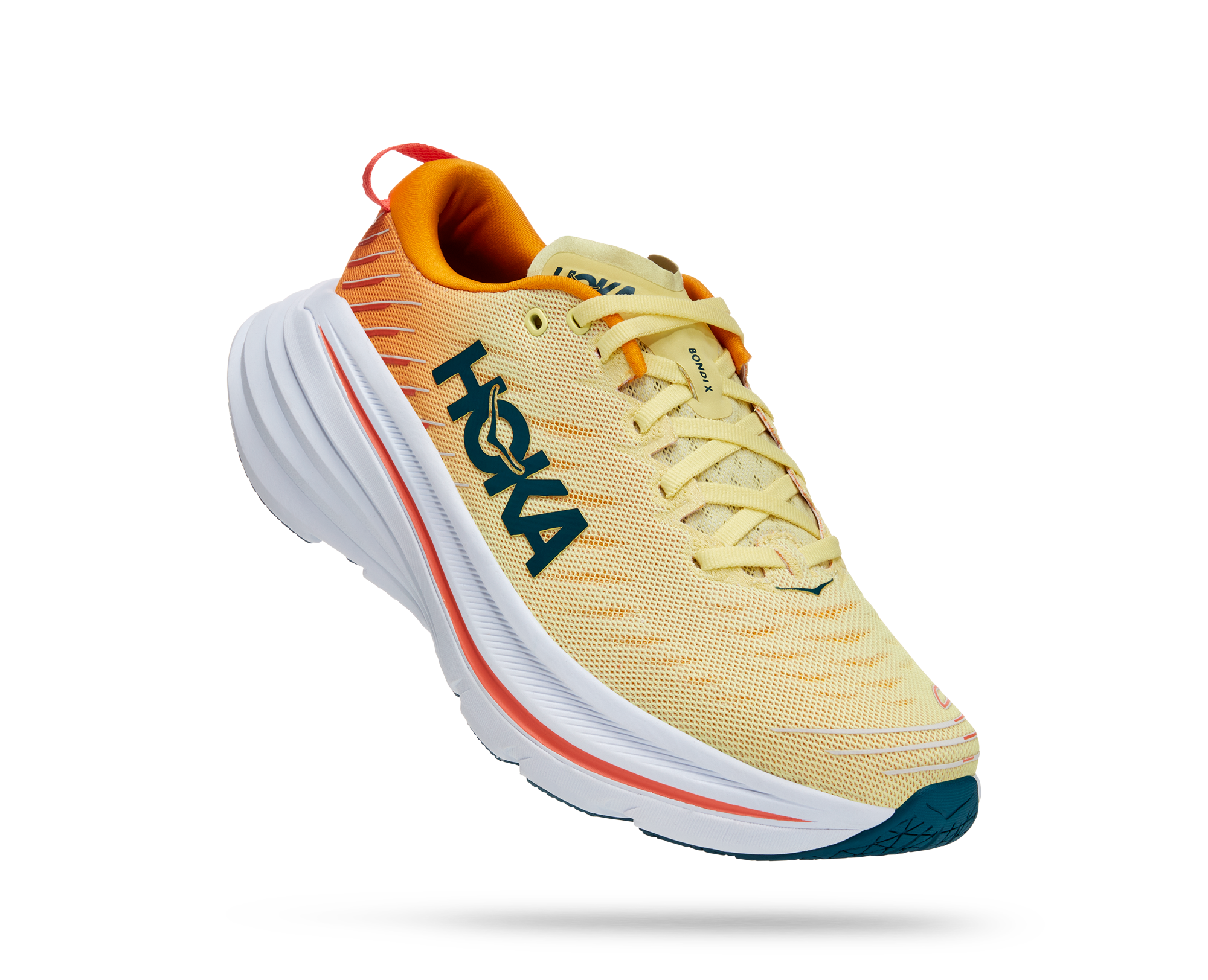 A maximally cushioned road shoe designed to go the distance, the game-changing Bondi X is spring-loaded with our propulsive carbon-fiber plate. The original Bondi cushioning and lines are here, providing the soft, balanced ride the franchise is known for. The Bondi X fine-tunes the geometry with an extended rocker for greater acceleration, while also delivering smoother toe-offs, thanks to the carbon-fiber plate. HOKA’s extended crash pad acts like a veritable marshmallow, employing the softest foam in our arsenal to date. Paired with a progressive upper with embroidered TPU yarn, the Bondi X will get you there, and then some.