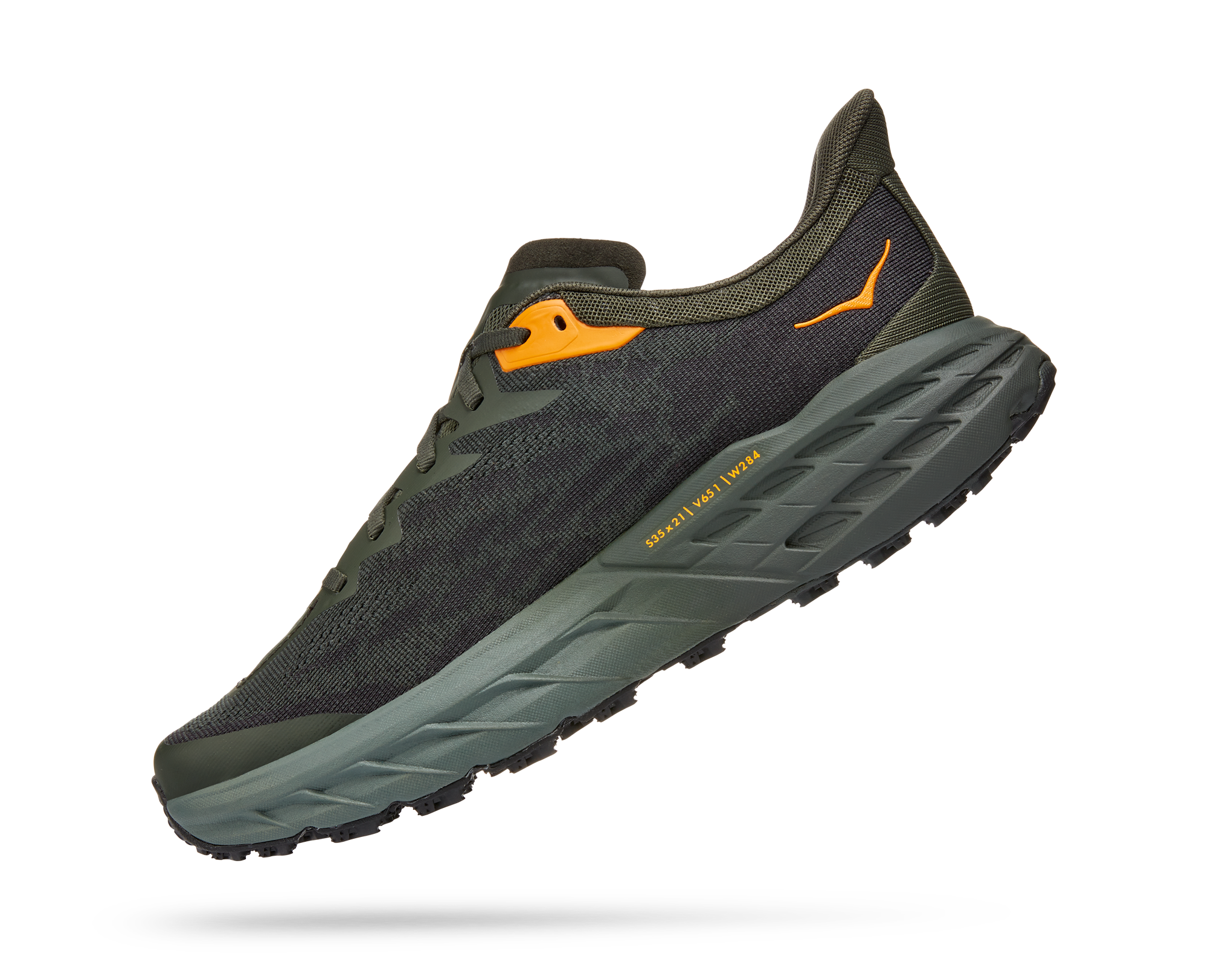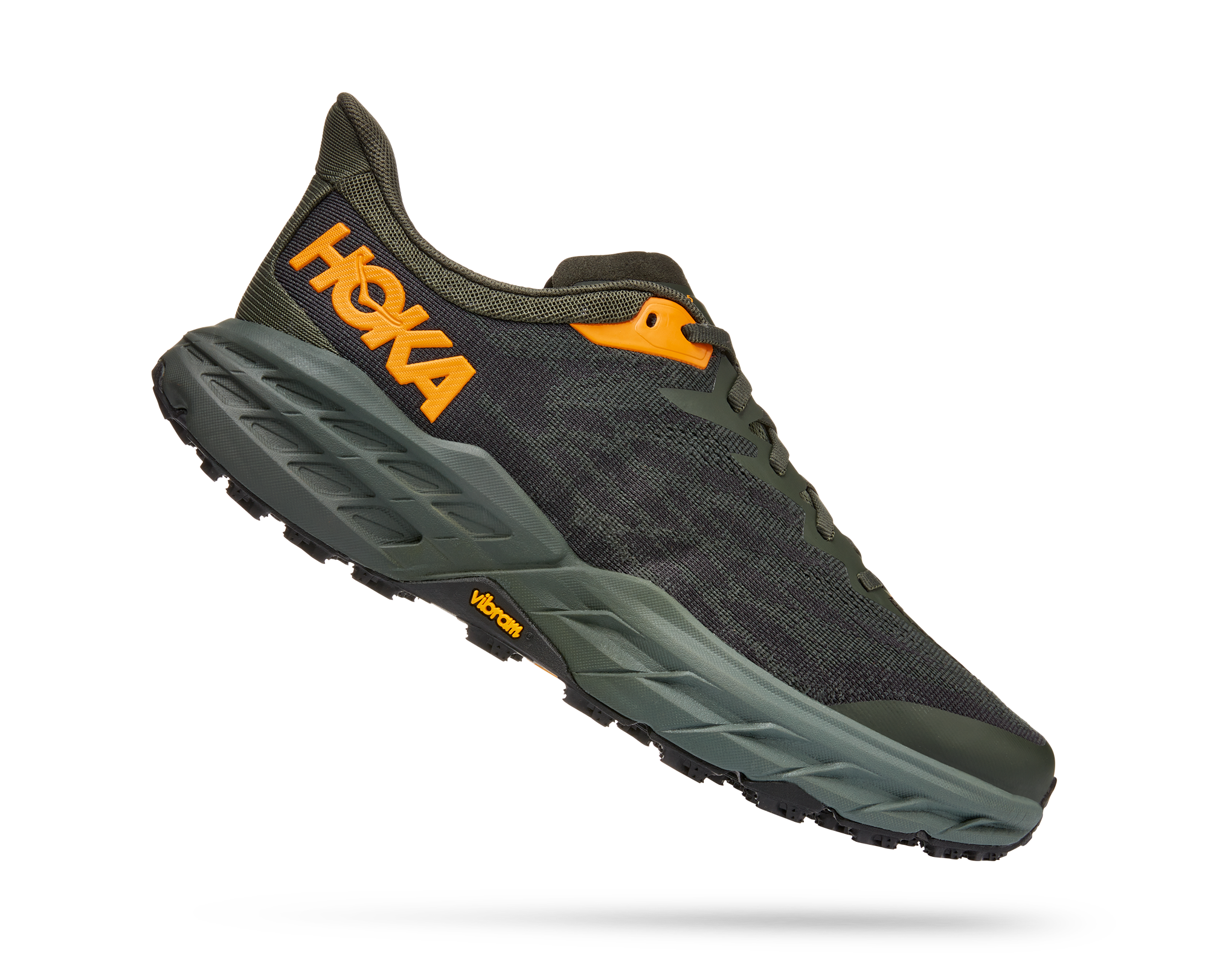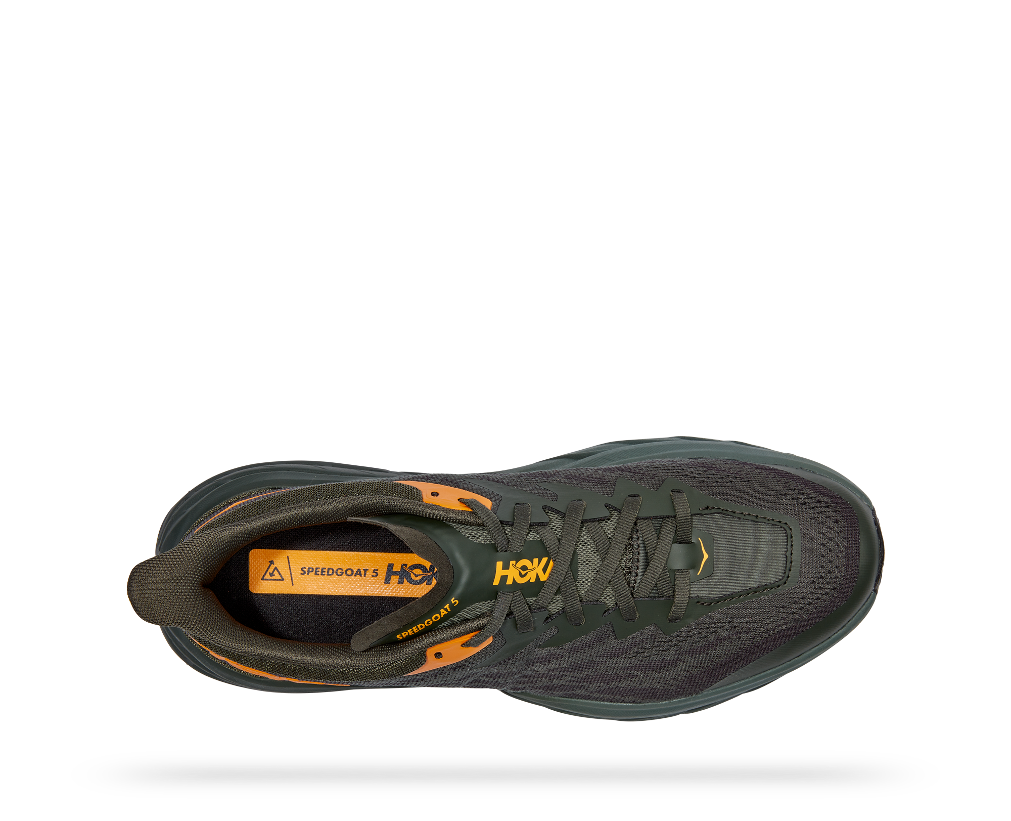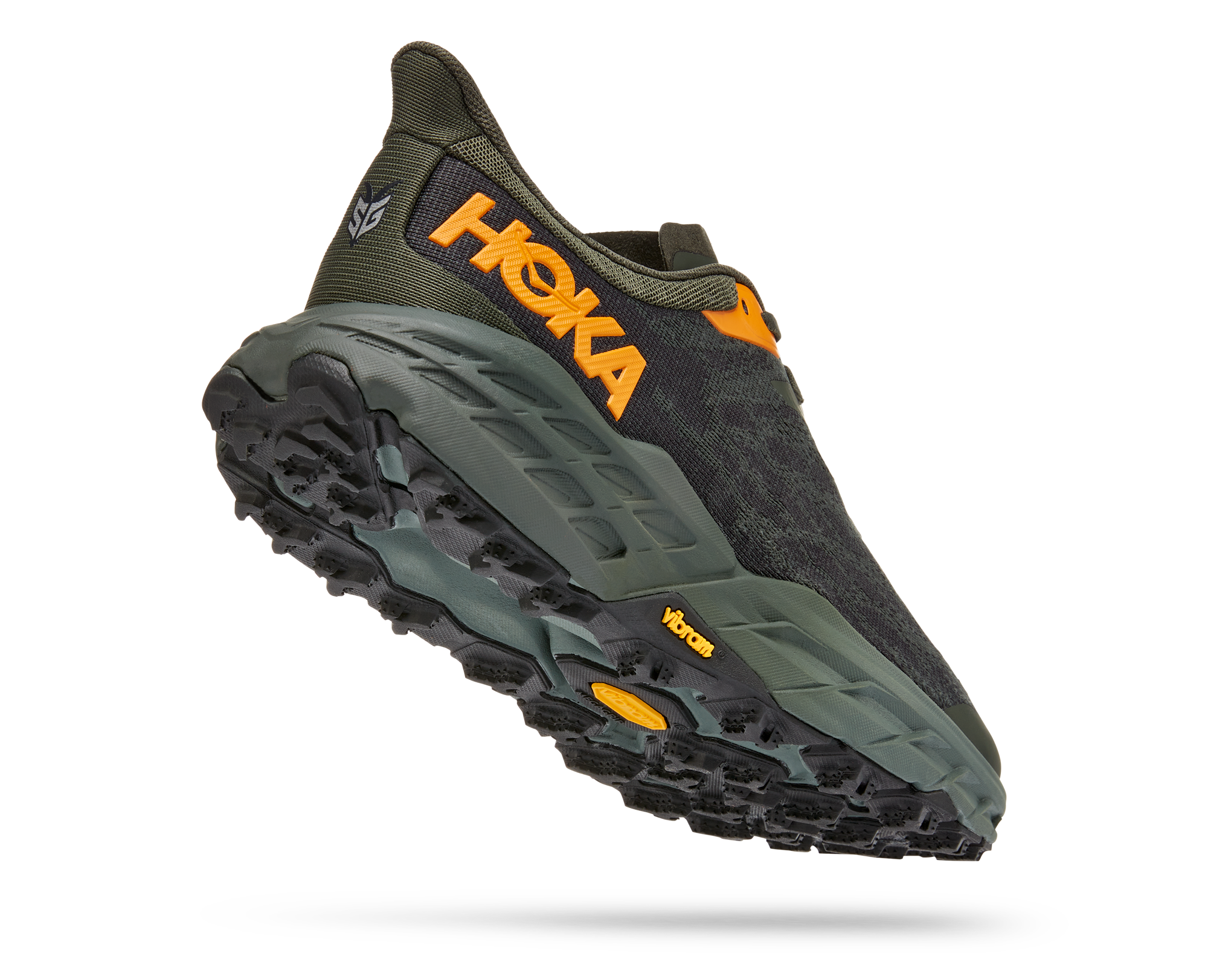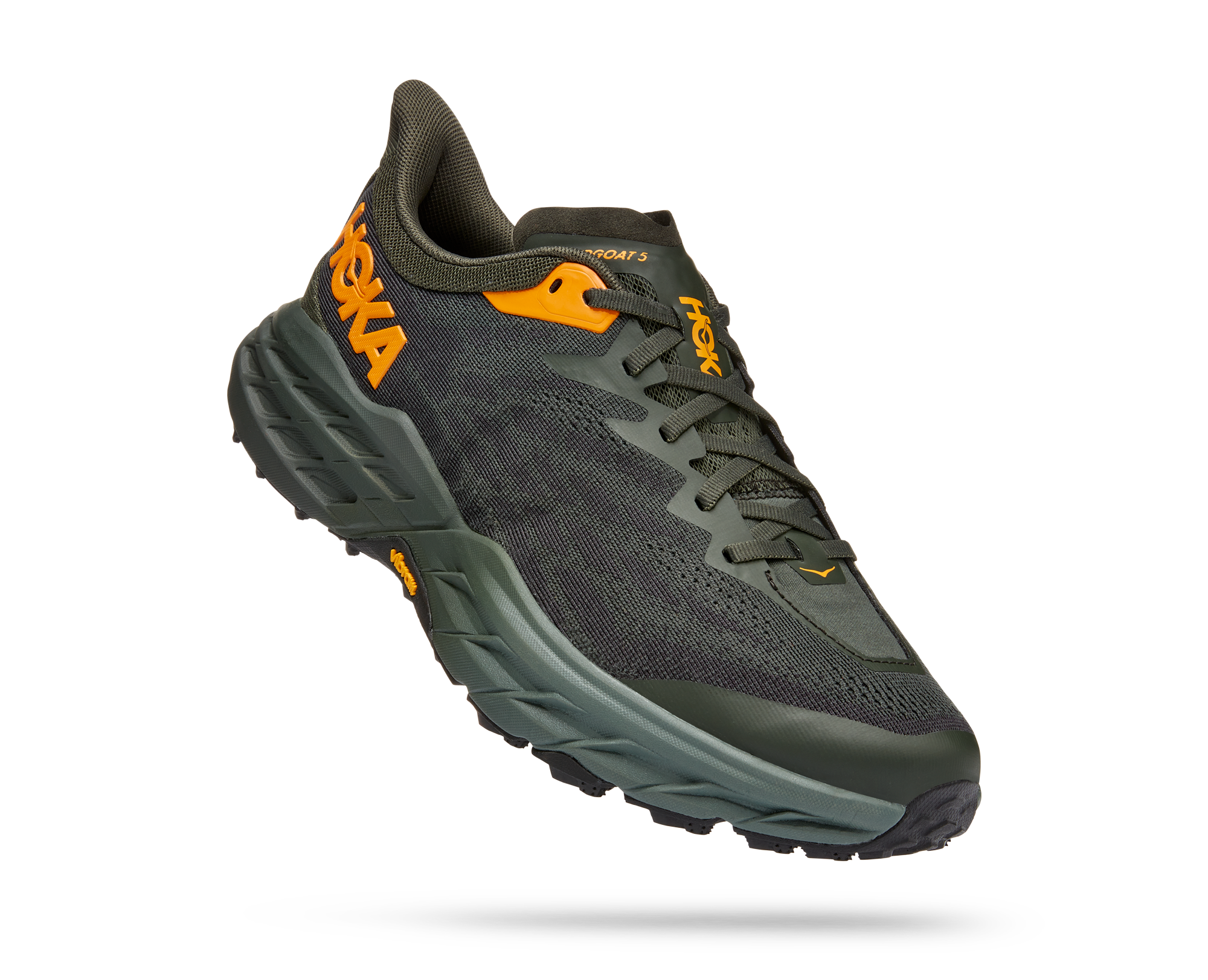 A workhorse designed for technical trails, the Speedgoat returns with less weight and more traction than ever before. A new shoe from outsole to laces, this trail beast is updated with Vibram Megagrip with Traction Lug for enhanced grip on loose soil. Retaining the same stack height and rocker profile, the Speedgoat 5 employs a lighter midsole compound and heartier, double layer jaquard mesh to inspire confidence on any terrain.