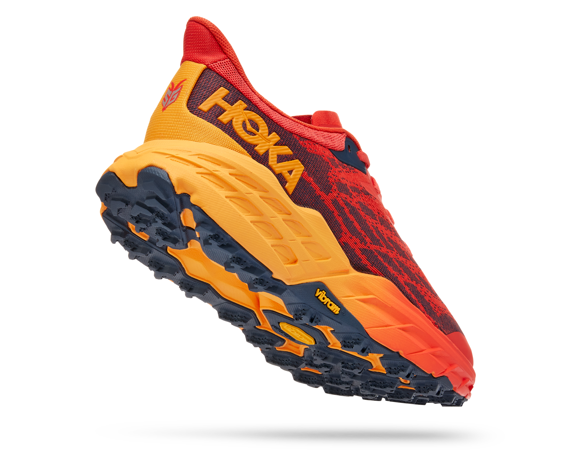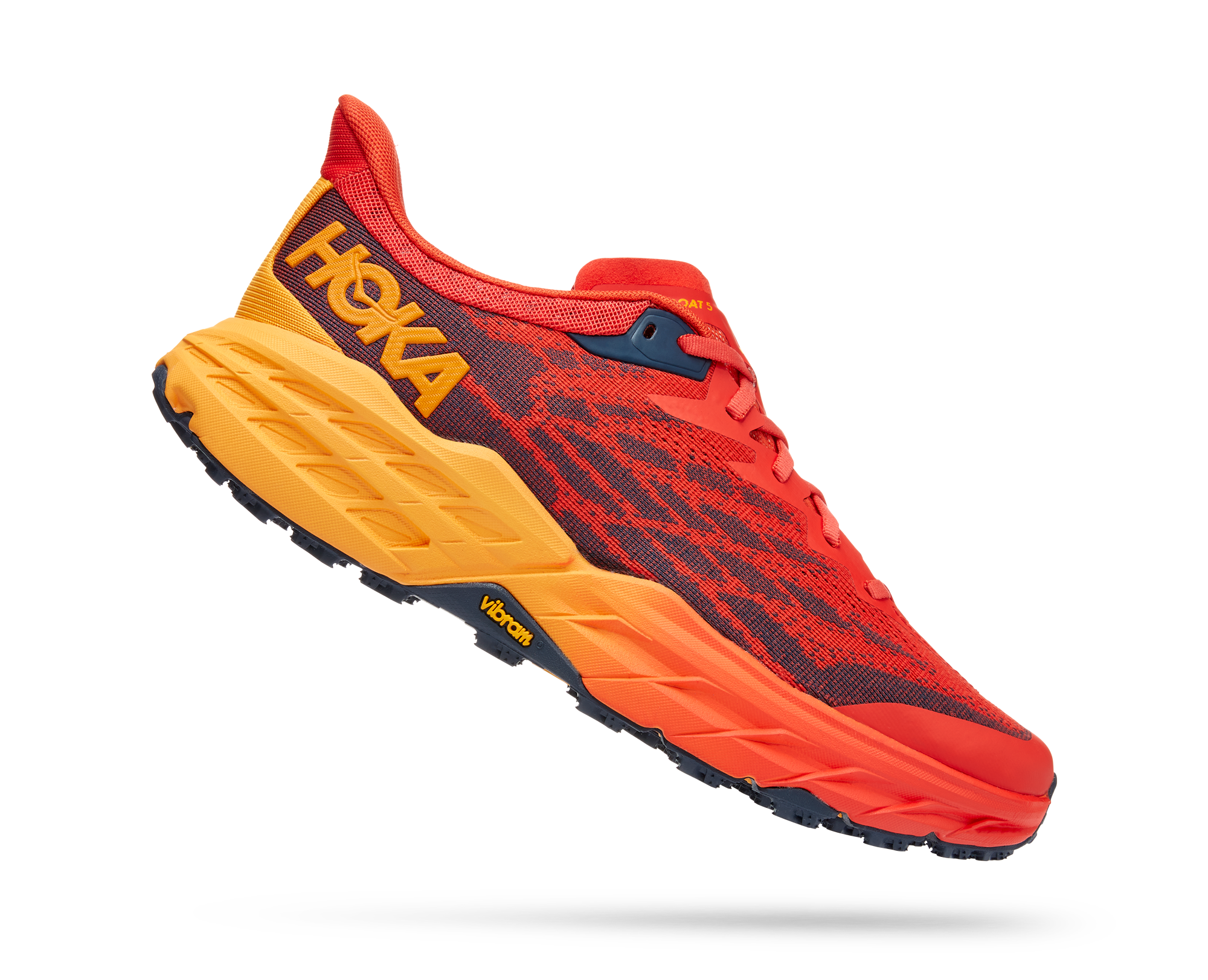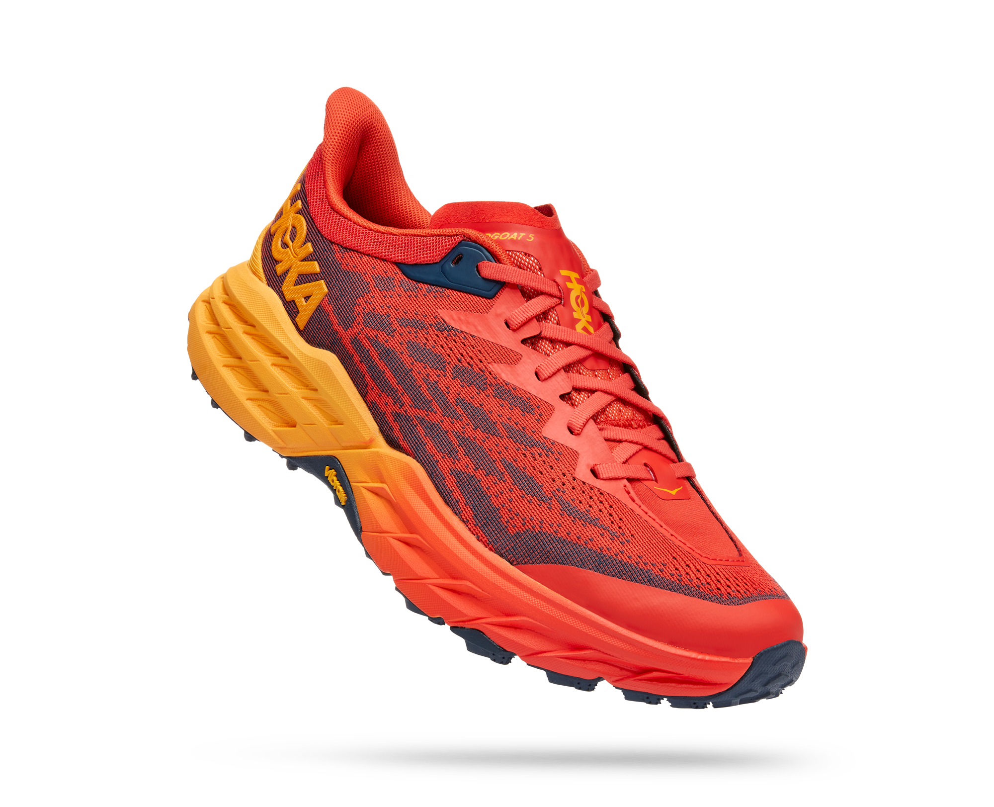 A workhorse designed for technical trails, the Speedgoat returns with less weight and more traction than ever before. A new shoe from outsole to laces, this trail beast is updated with Vibram Megagrip with Traction Lug for enhanced grip on loose soil. Retaining the same stack height and rocker profile, the Speedgoat 5 employs a lighter midsole compound and heartier, double layer jaquard mesh to inspire confidence on any terrain.