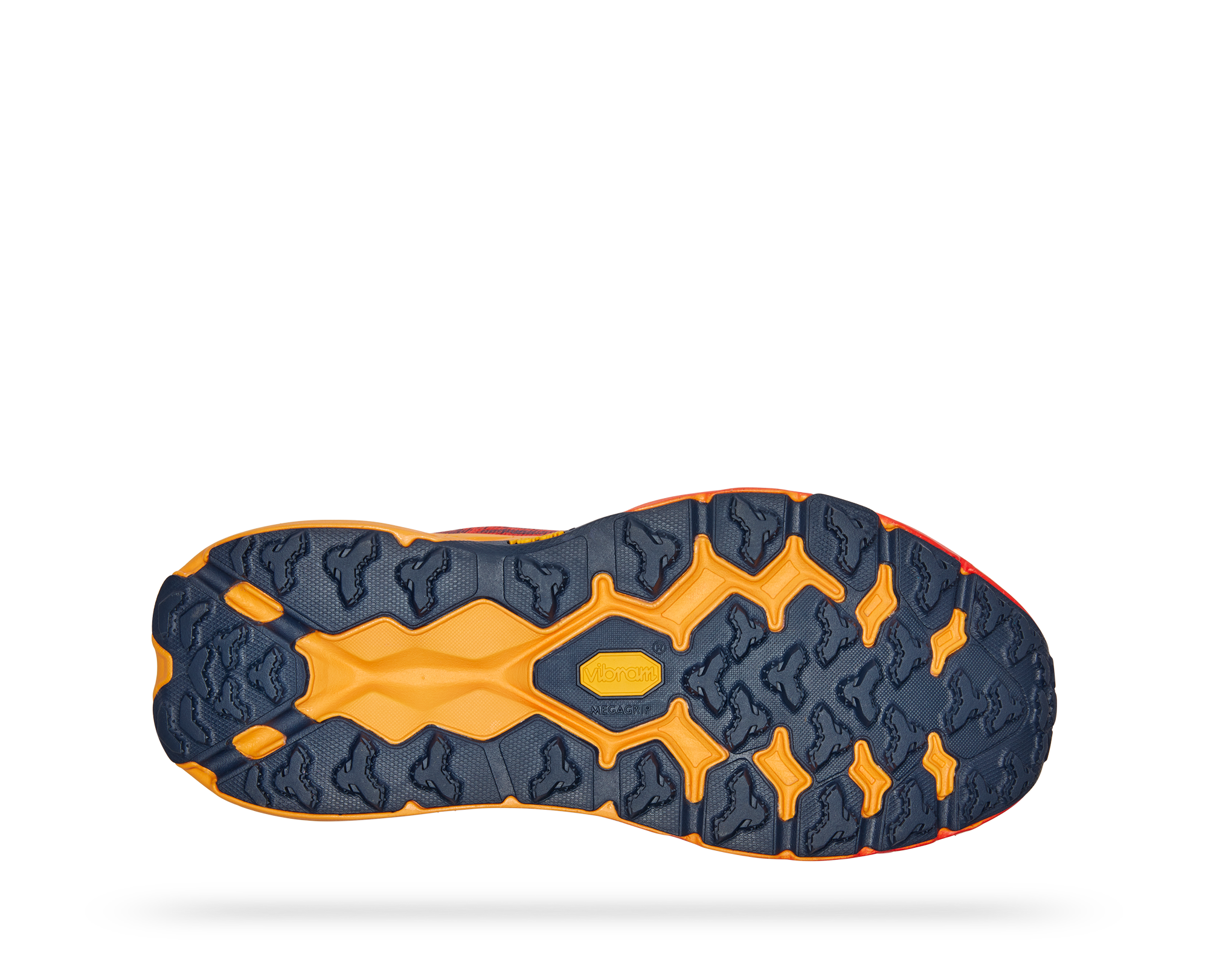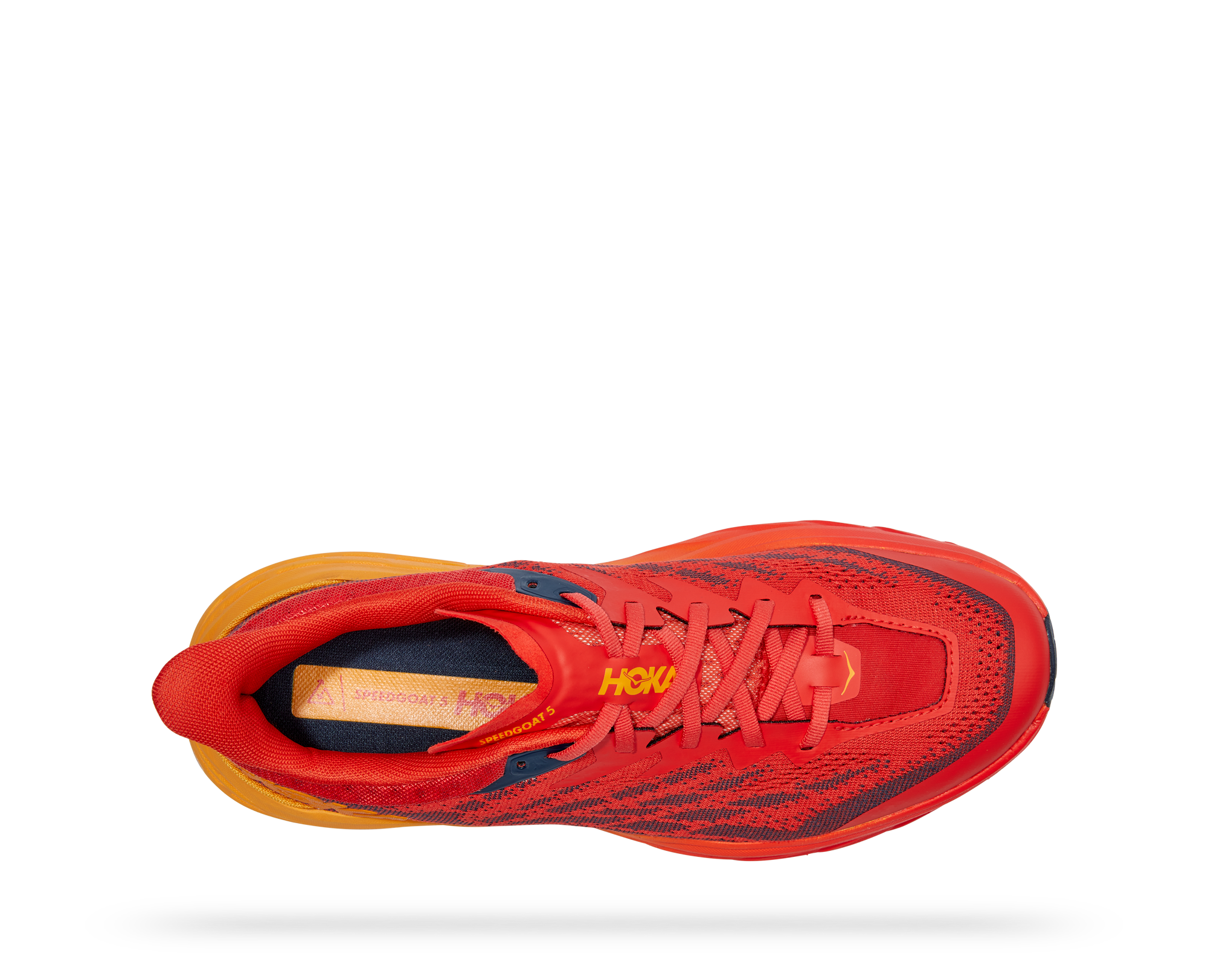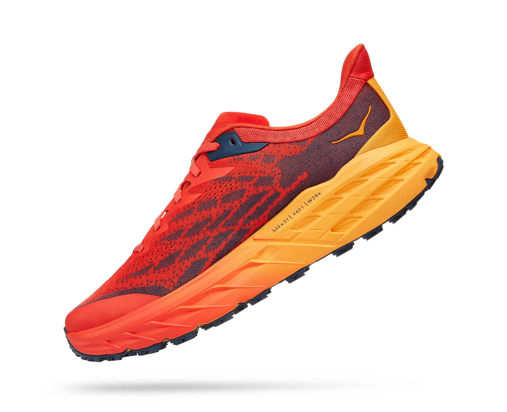 A workhorse designed for technical trails, the Speedgoat returns with less weight and more traction than ever before. A new shoe from outsole to laces, this trail beast is updated with Vibram Megagrip with Traction Lug for enhanced grip on loose soil. Retaining the same stack height and rocker profile, the Speedgoat 5 employs a lighter midsole compound and heartier, double layer jaquard mesh to inspire confidence on any terrain.