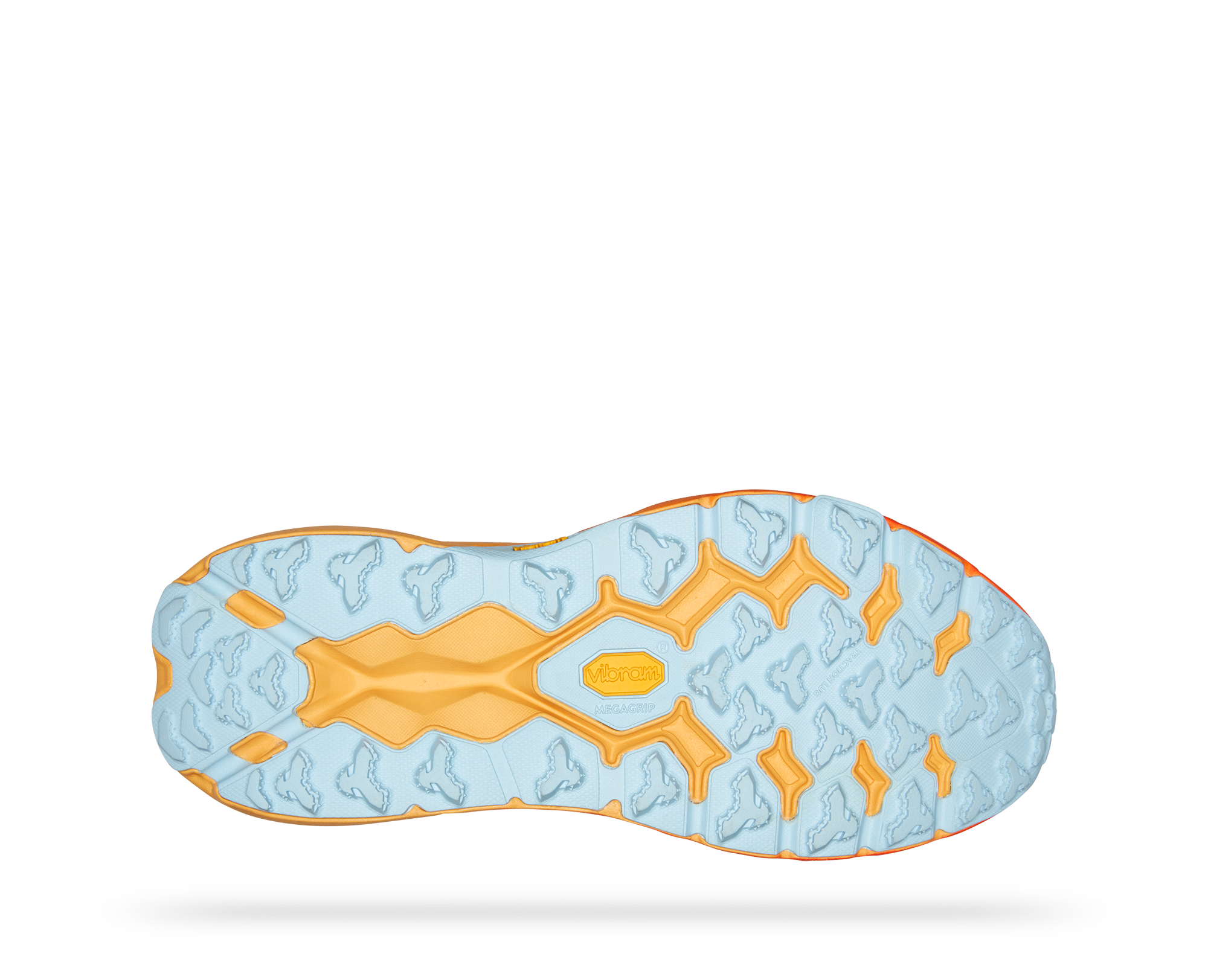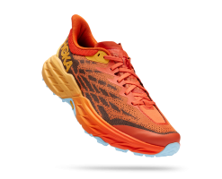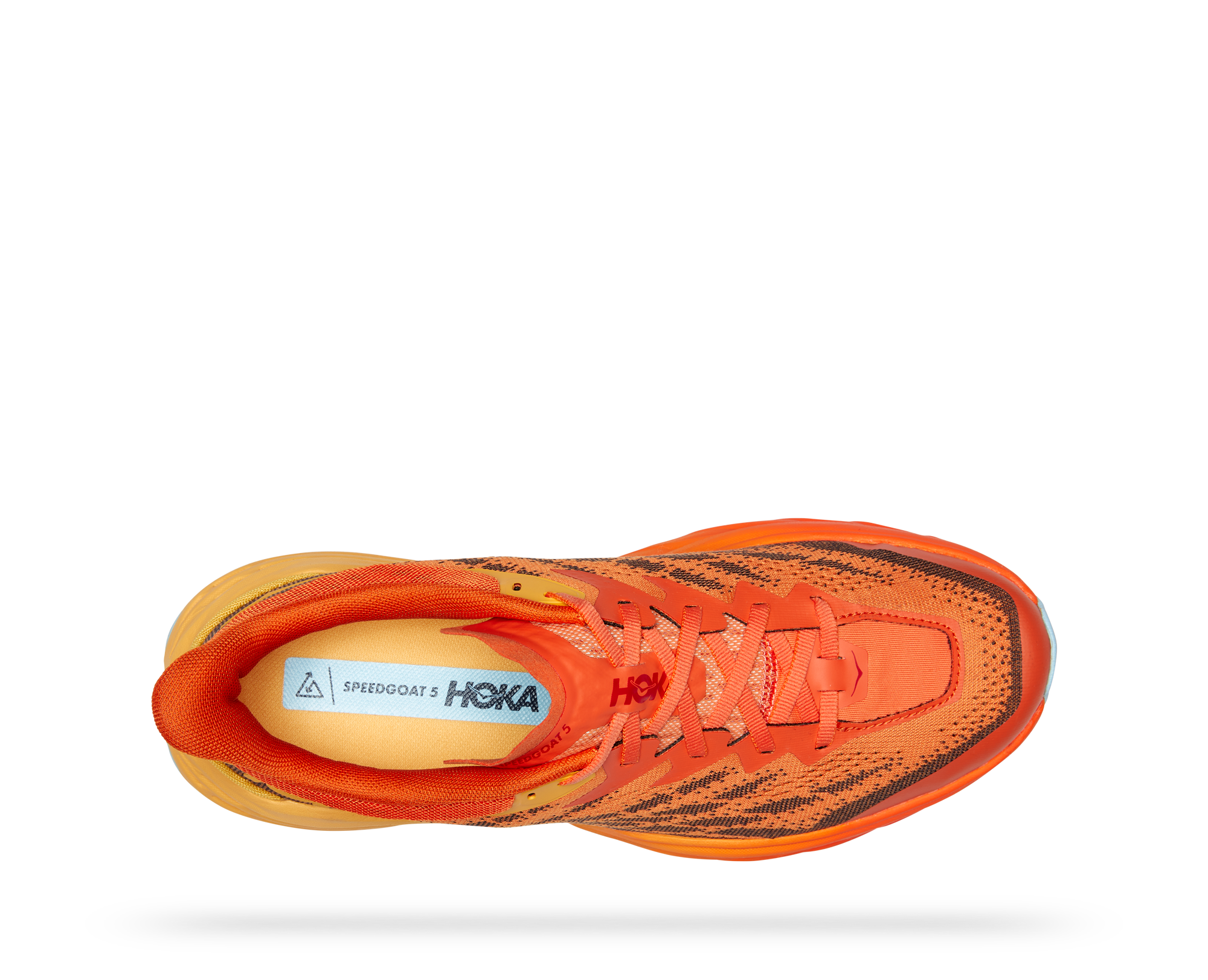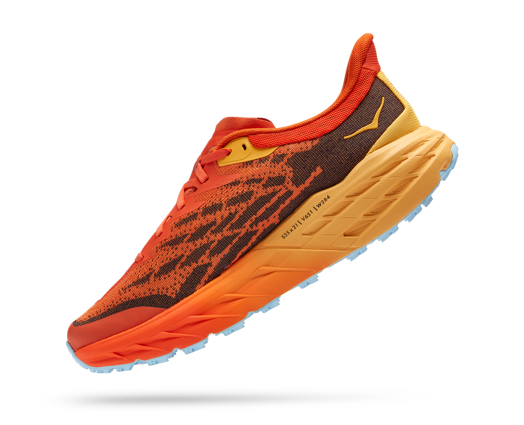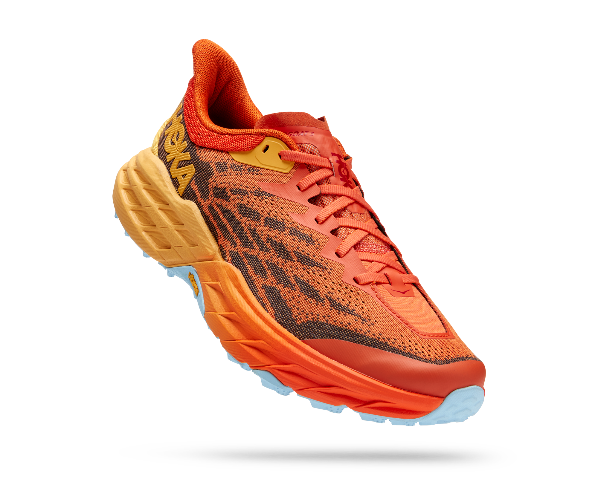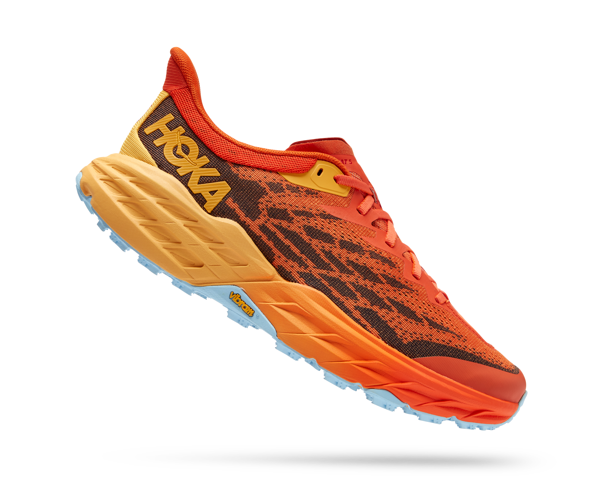 A workhorse designed for technical trails, the Speedgoat returns with less weight and more traction than ever before. A new shoe from outsole to laces, this trail beast is updated with Vibram Megagrip with Traction Lug for enhanced grip on loose soil. Retaining the same stack height and rocker profile, the Speedgoat 5 employs a lighter midsole compound and heartier, double layer jaquard mesh to inspire confidence on any terrain.