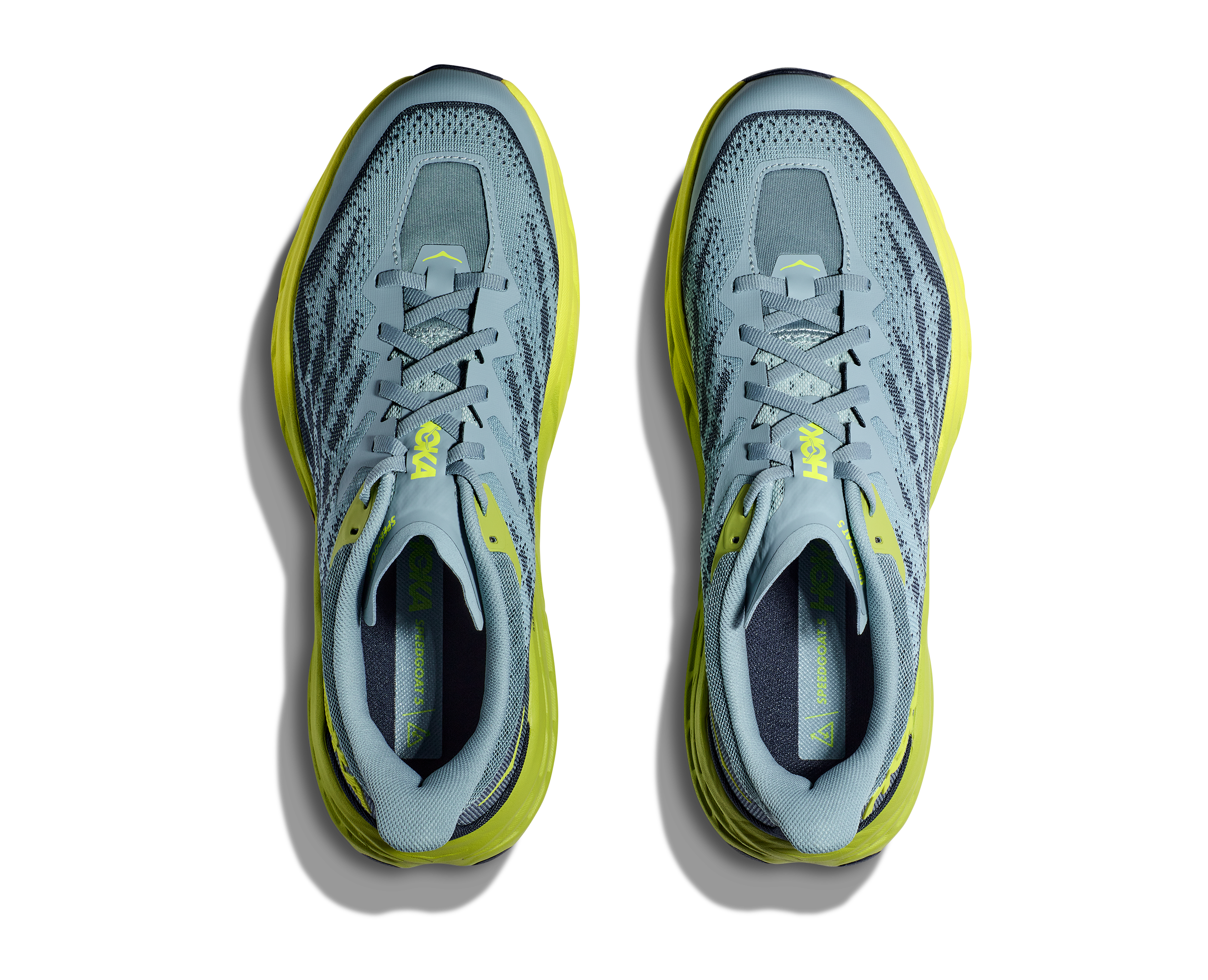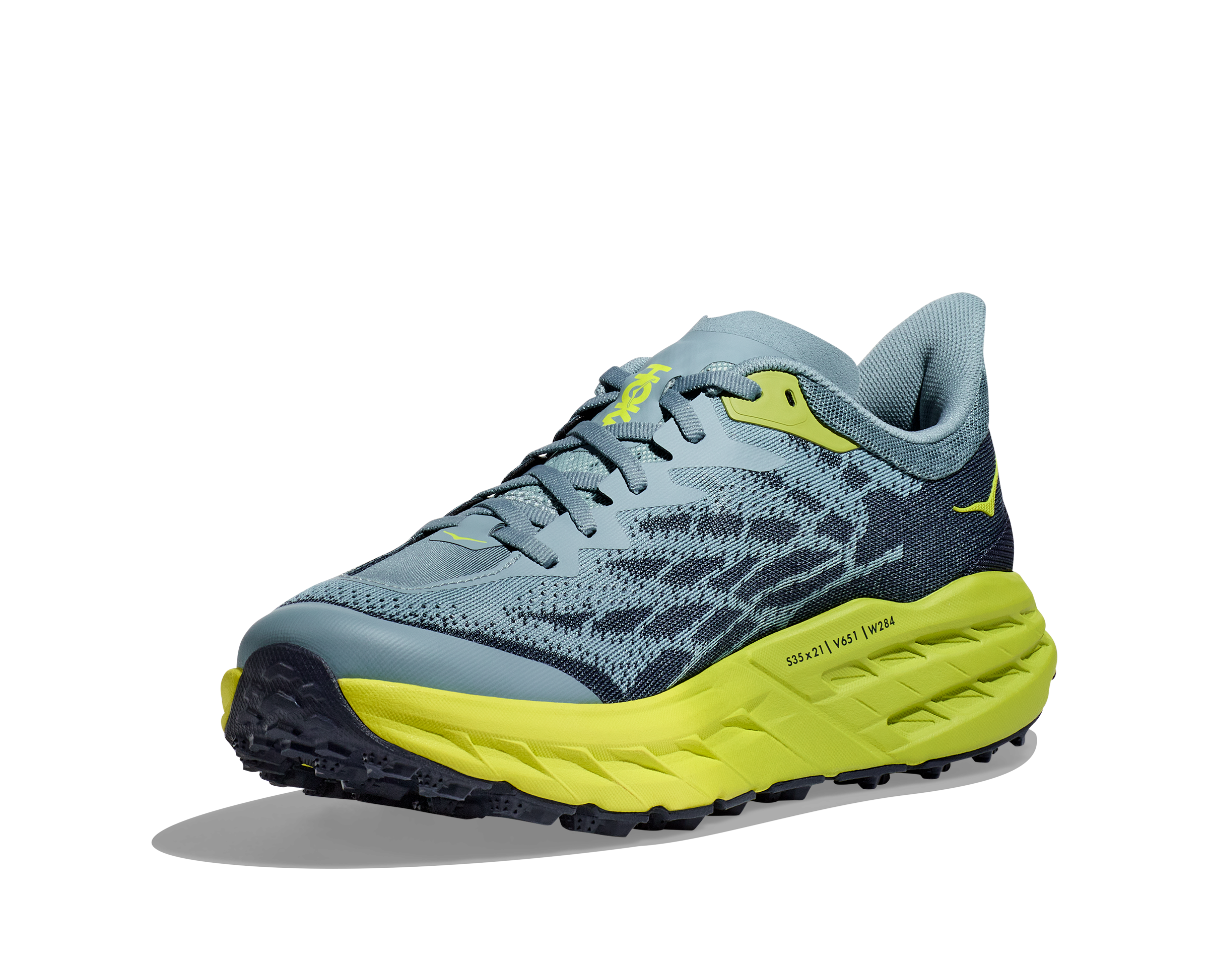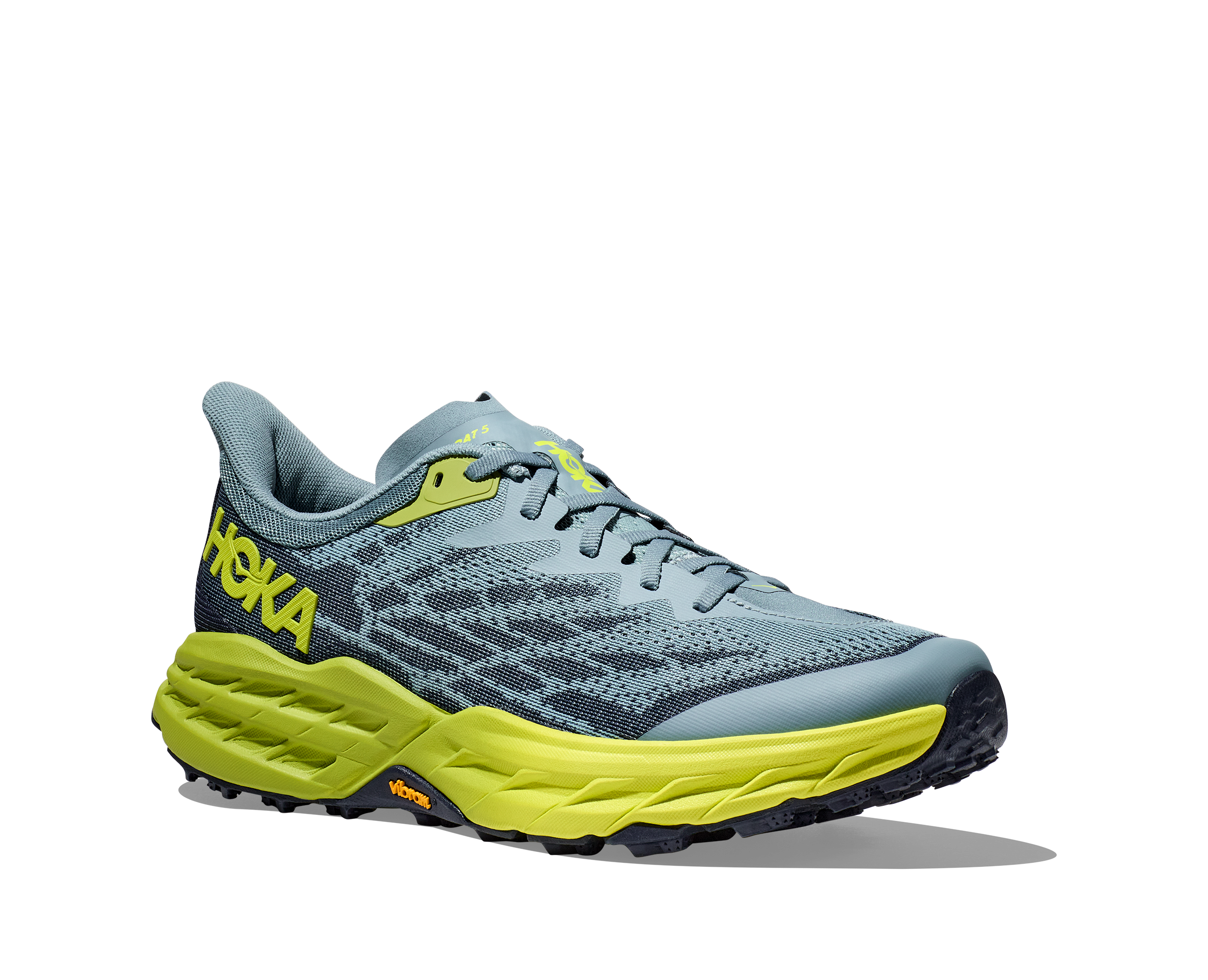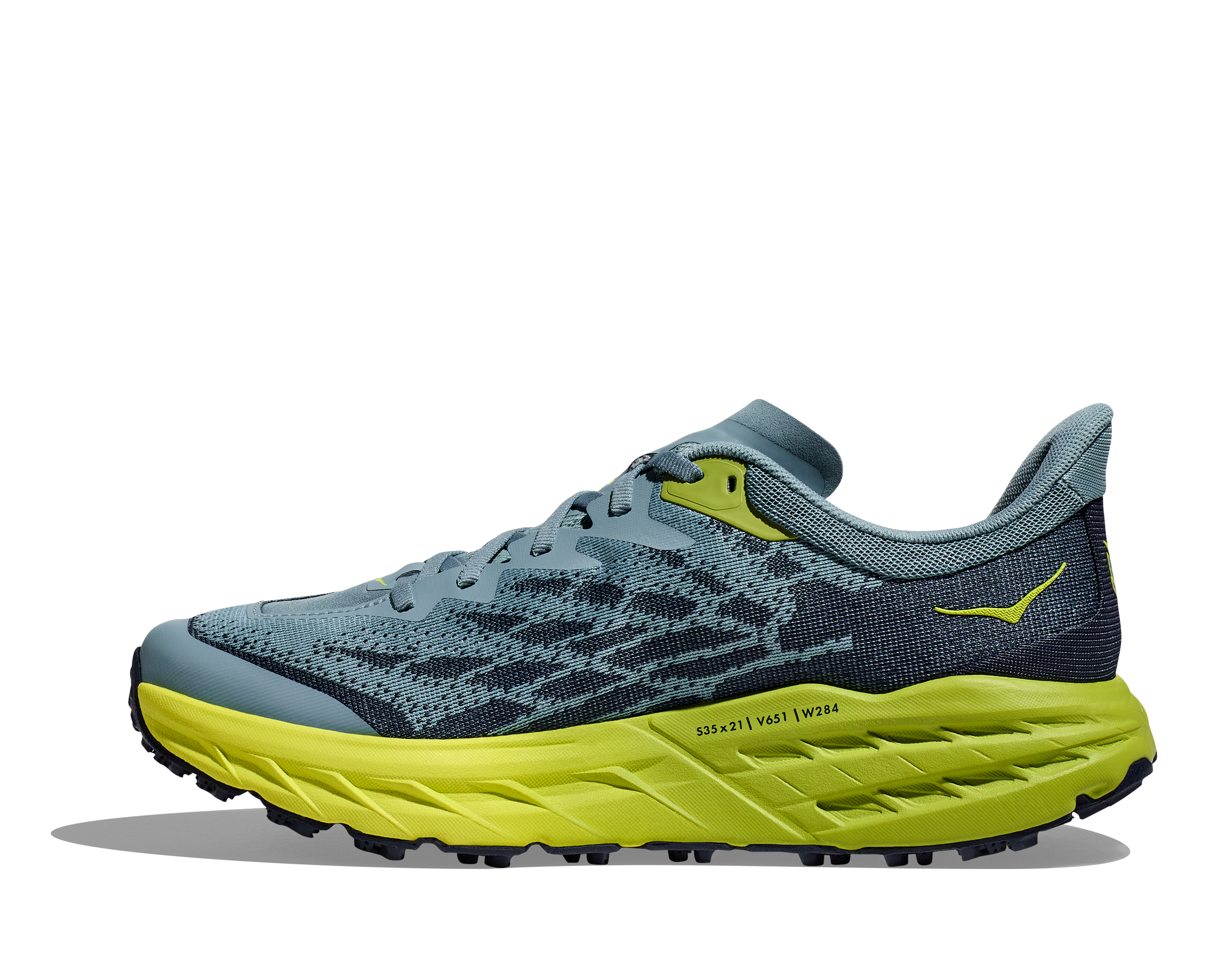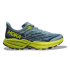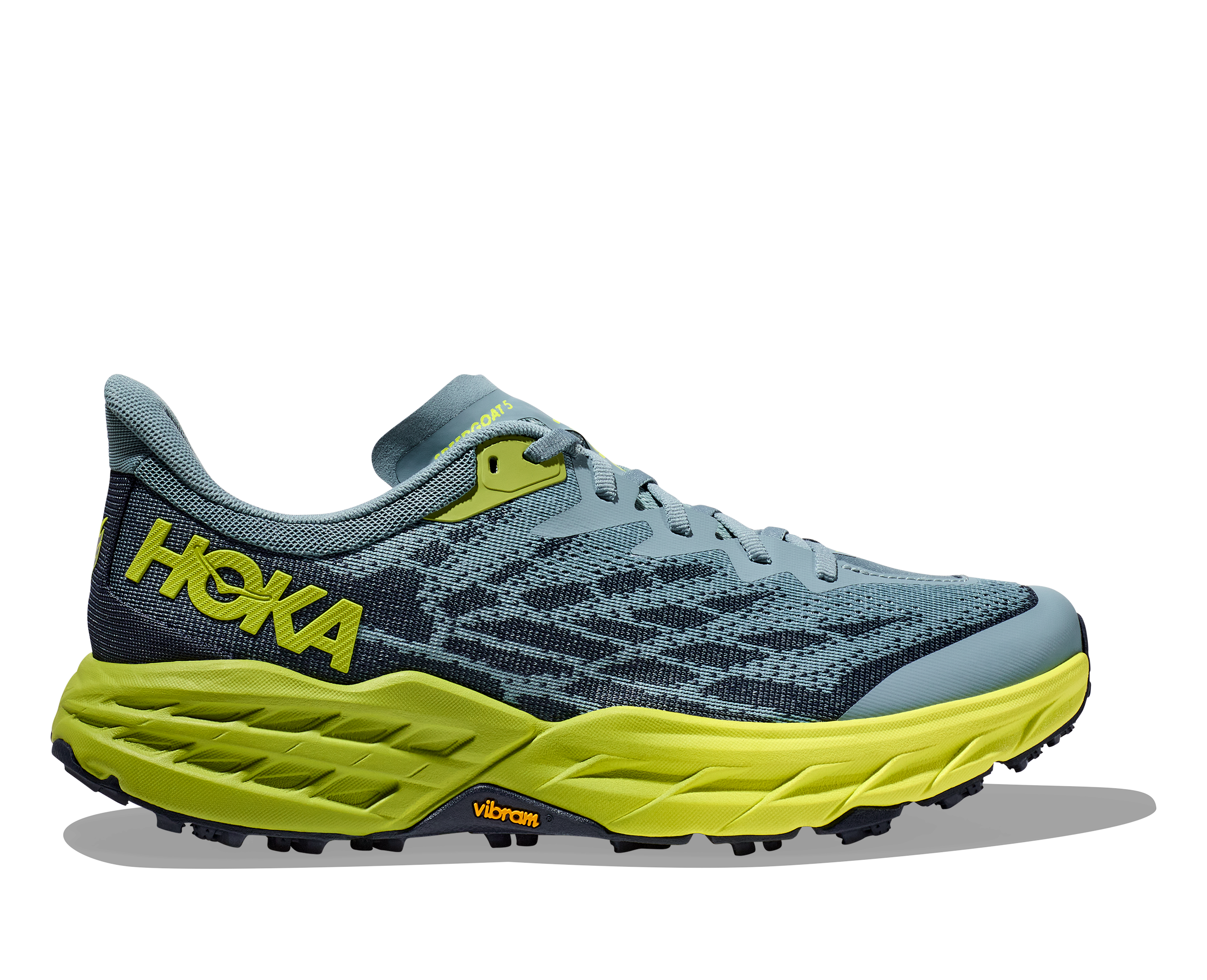 A workhorse designed for technical trails, the Speedgoat returns with less weight and more traction than ever before. A new shoe from outsole to laces, this trail beast is updated with Vibram Megagrip with Traction Lug for enhanced grip on loose soil. Retaining the same stack height and rocker profile, the Speedgoat 5 employs a lighter midsole compound and heartier, double layer jaquard mesh to inspire confidence on any terrain.
