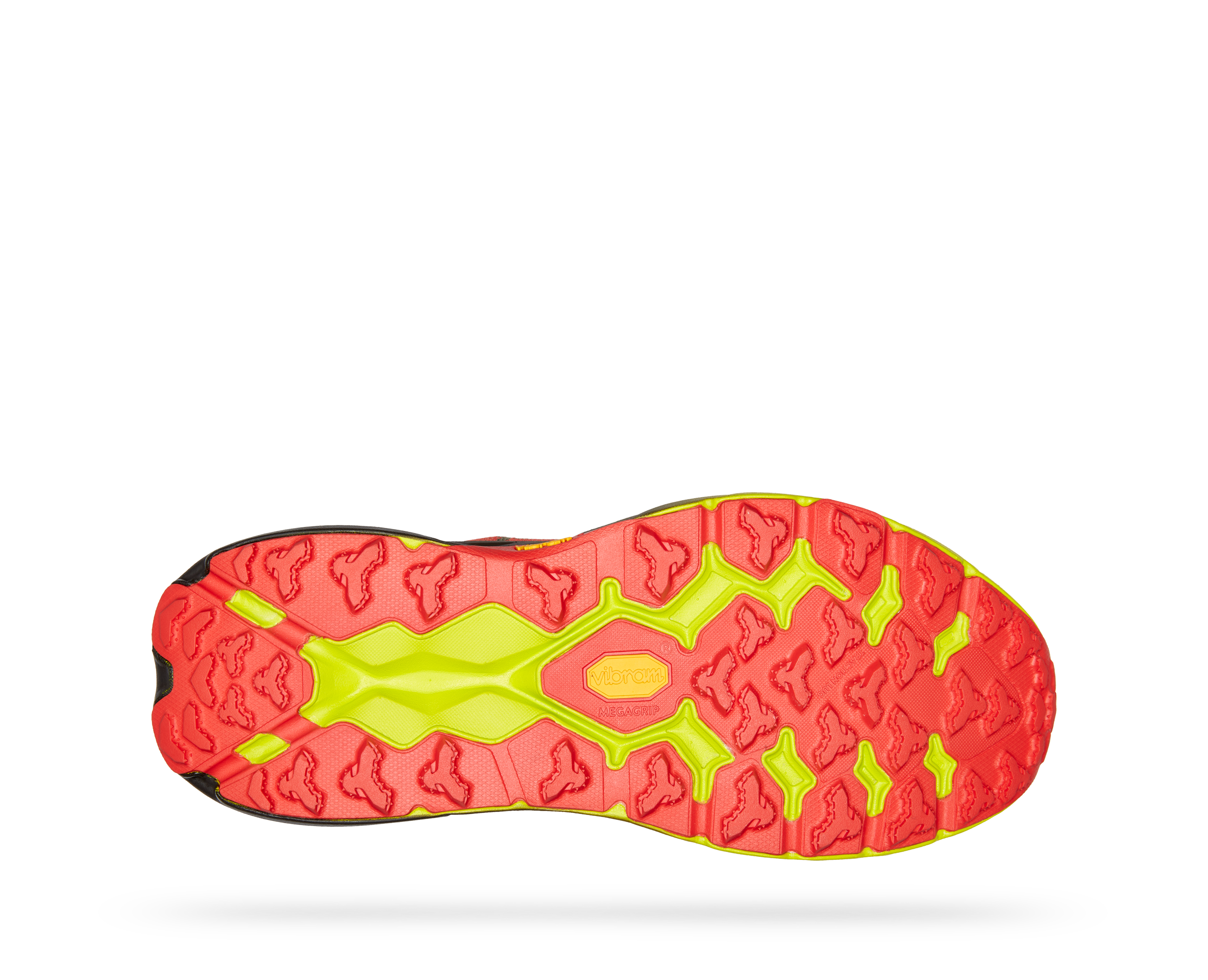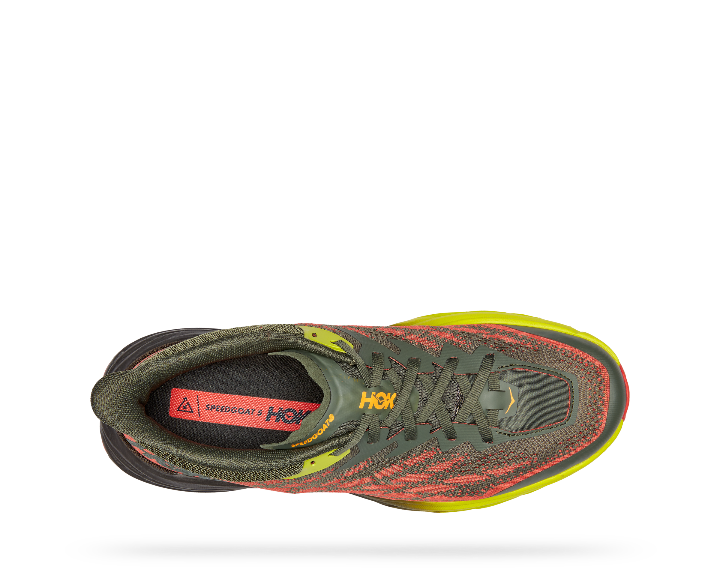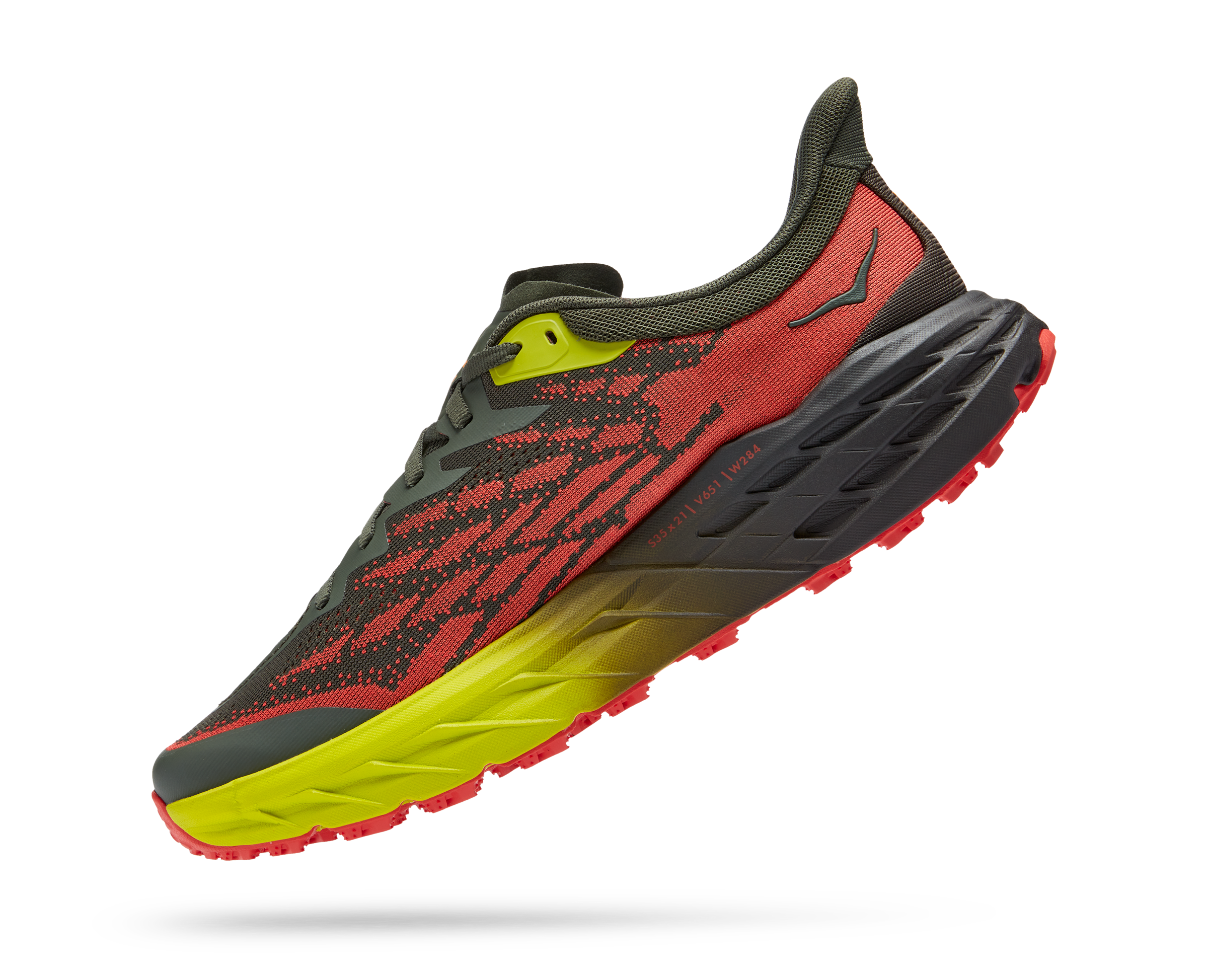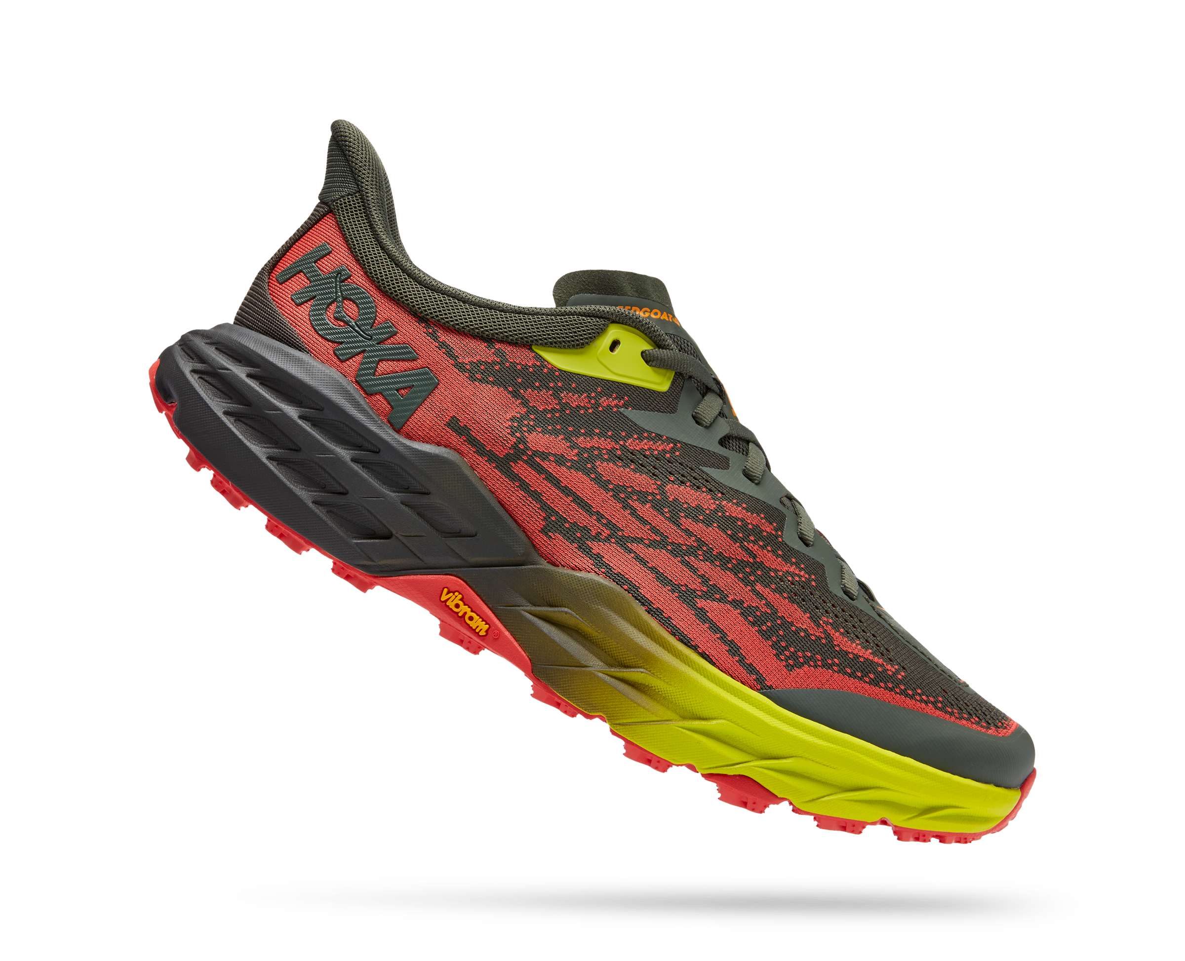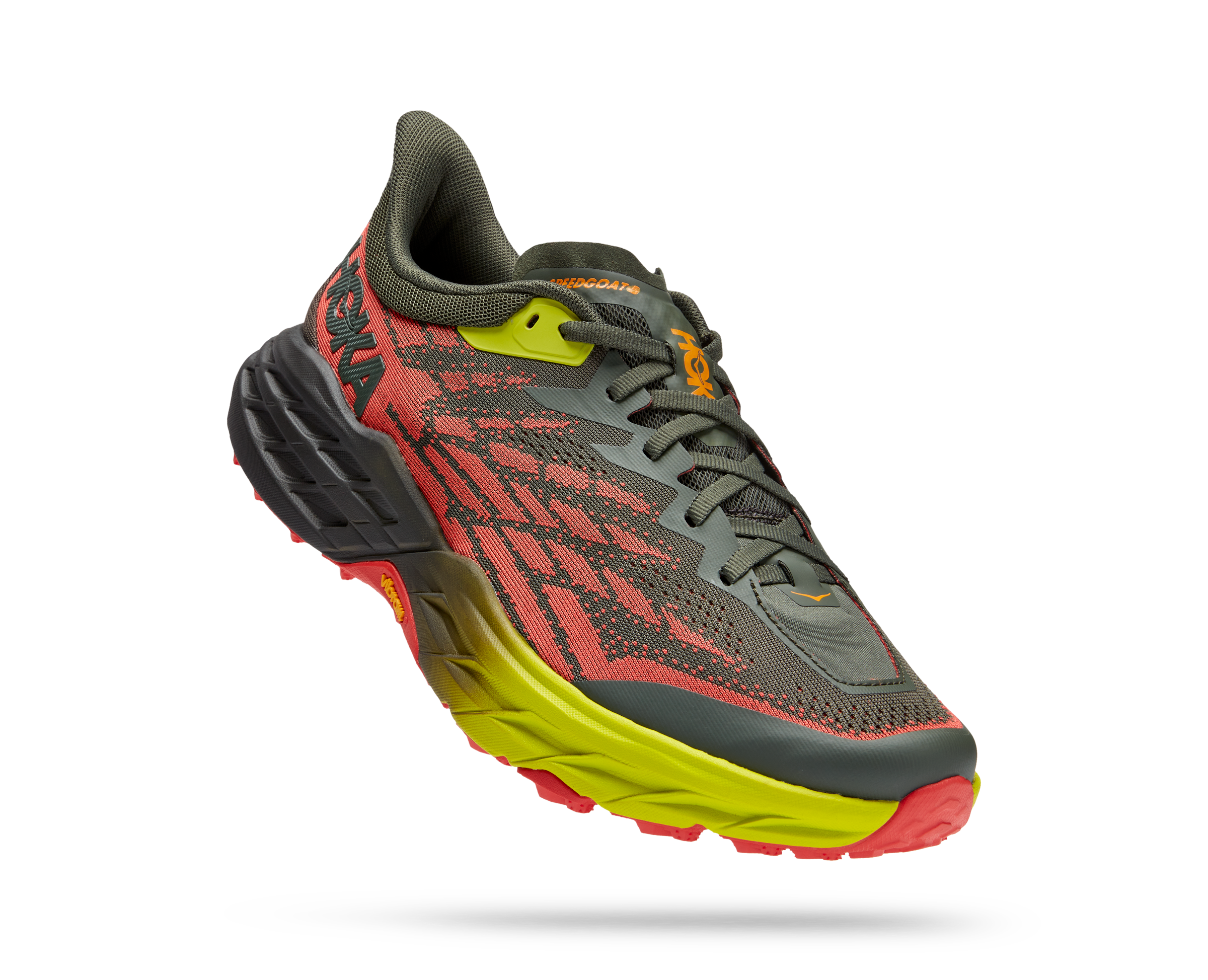 A workhorse designed for technical trails, the Speedgoat returns with less weight and more traction than ever before. A new shoe from outsole to laces, this trail beast is updated with Vibram Megagrip with Traction Lug for enhanced grip on loose soil. Retaining the same stack height and rocker profile, the Speedgoat 5 employs a lighter midsole compound and heartier, double layer jaquard mesh to inspire confidence on any terrain.