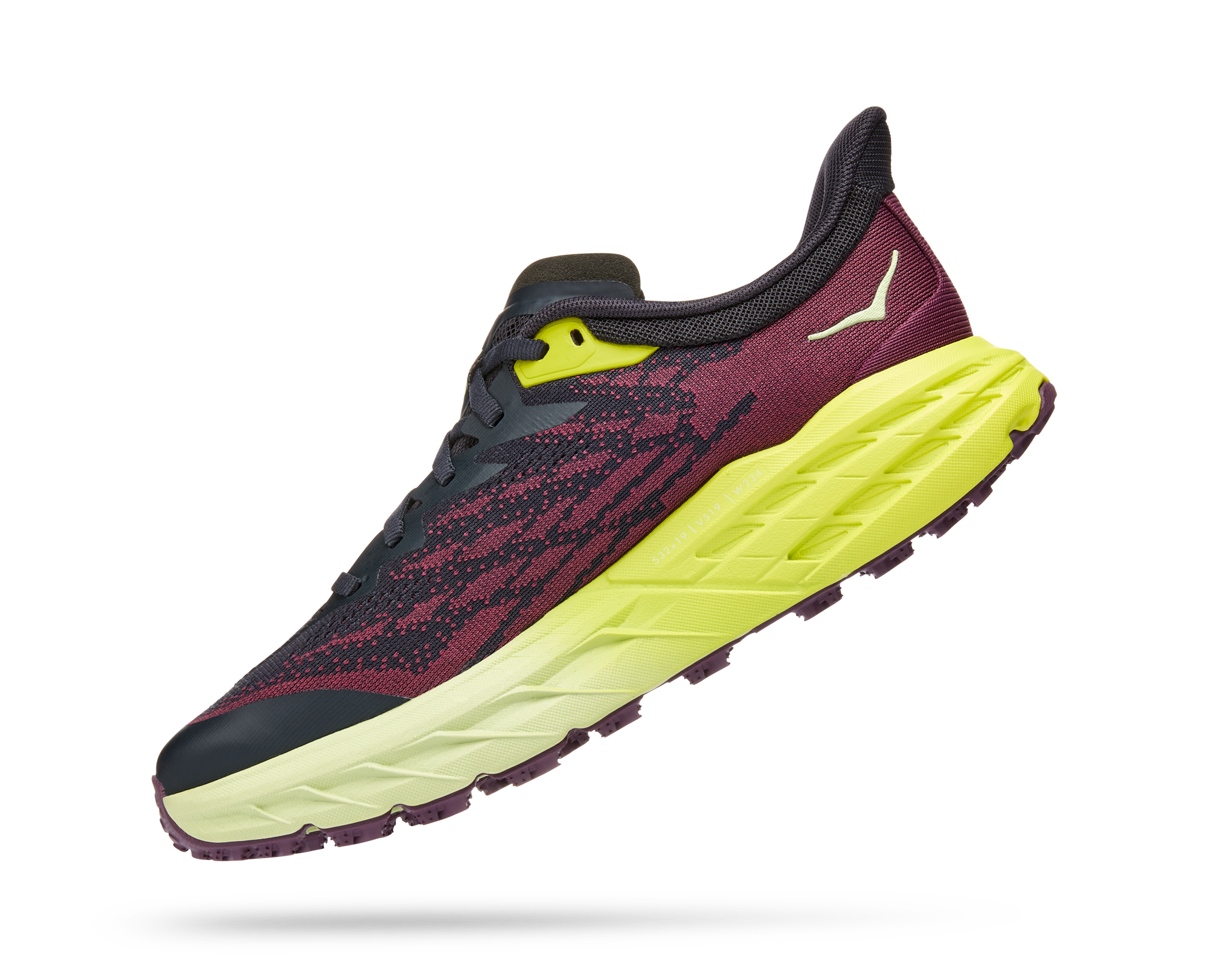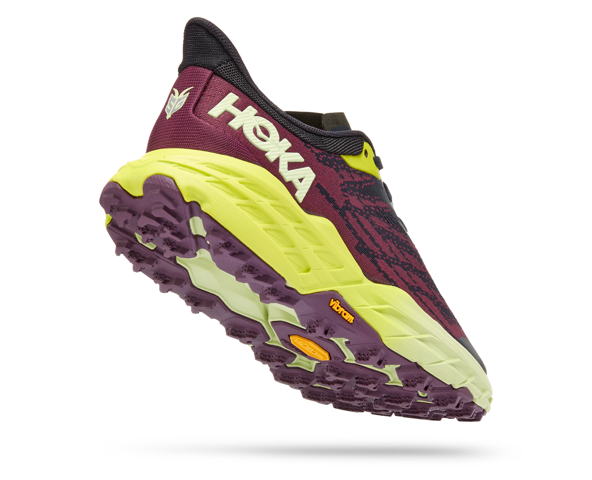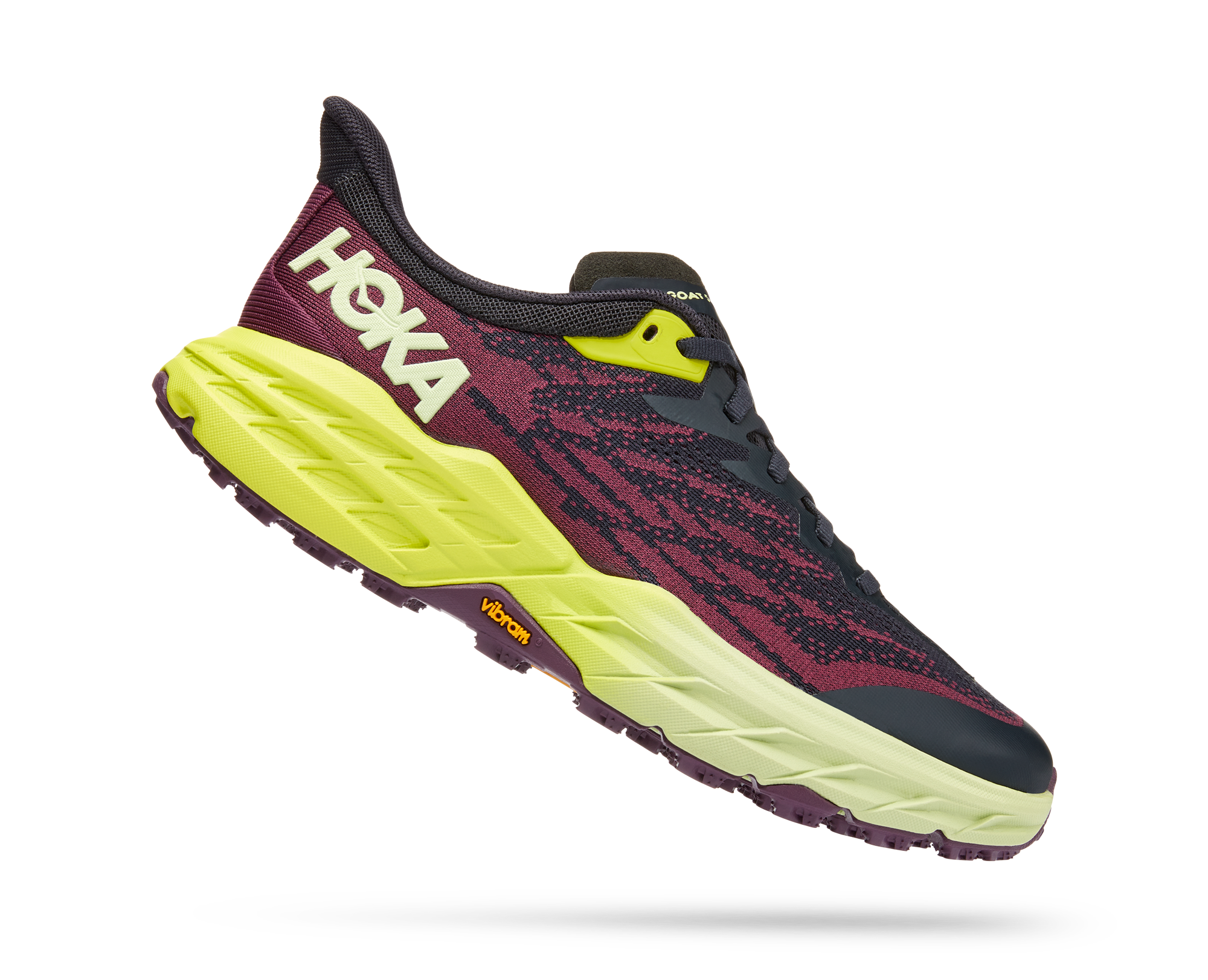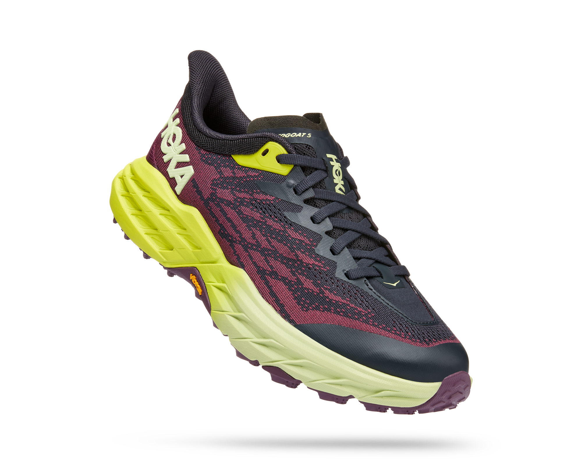 A workhorse designed for technical trails, the Speedgoat returns with less weight and more traction than ever before. A new shoe from outsole to laces, this trail beast is updated with Vibram Megagrip with Traction Lug for enhanced grip on loose soil. Retaining the same stack height and rocker profile, the Speedgoat 5 employs a lighter midsole compound and heartier, double layer jaquard mesh to inspire confidence on any terrain.
