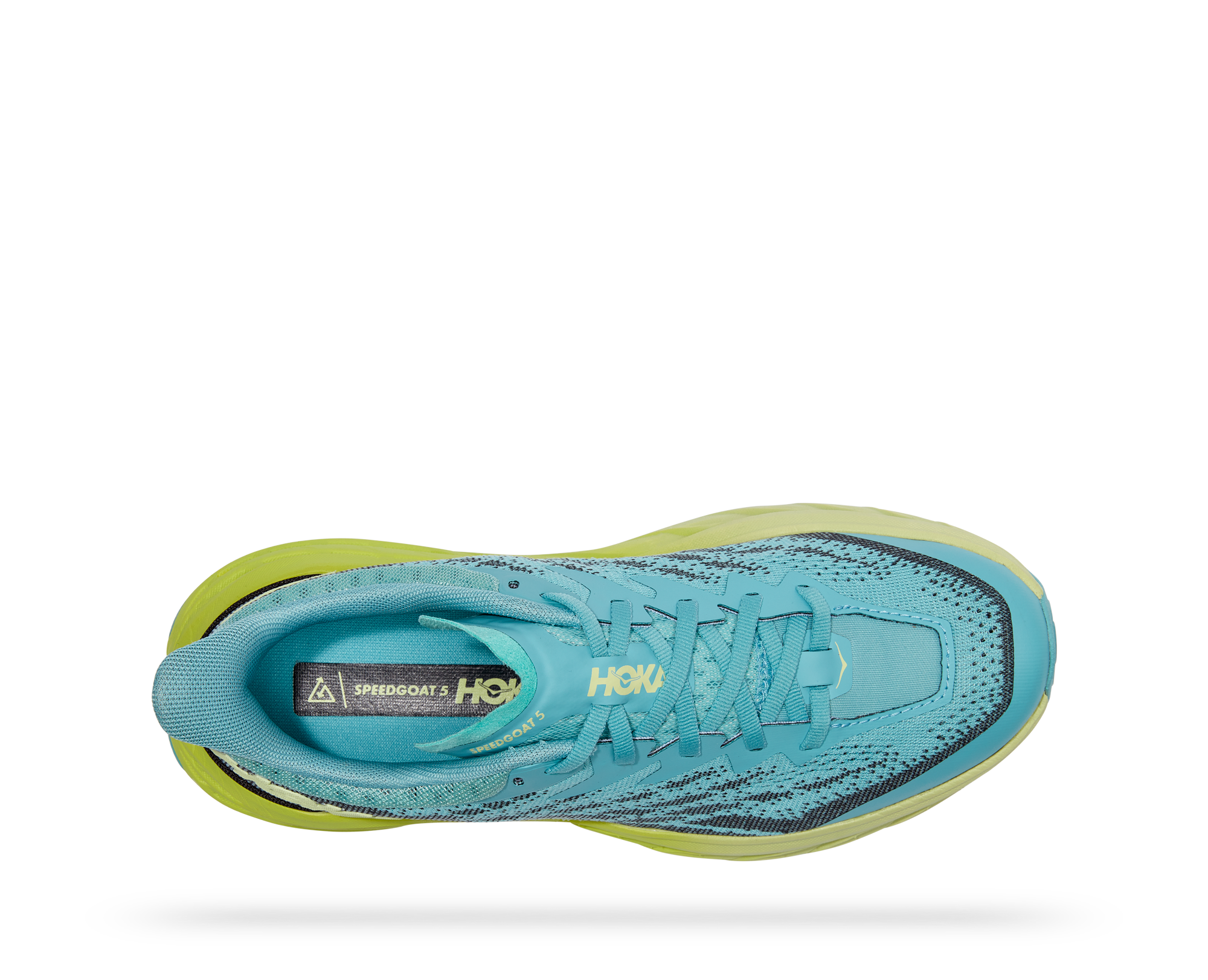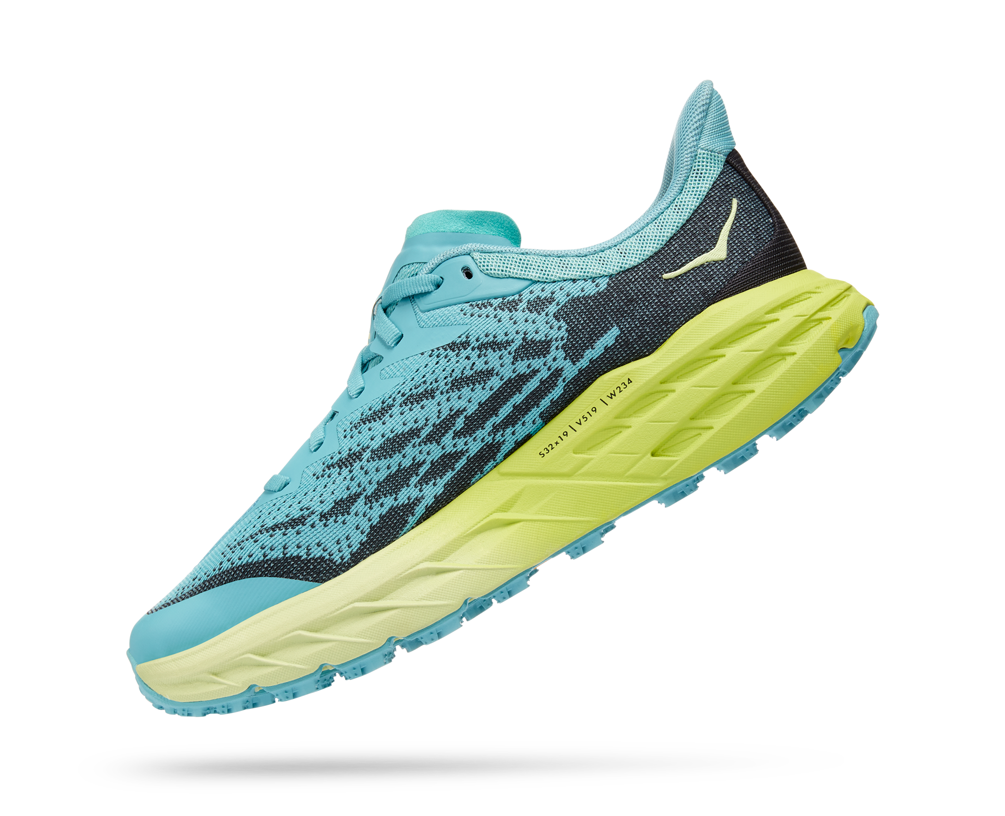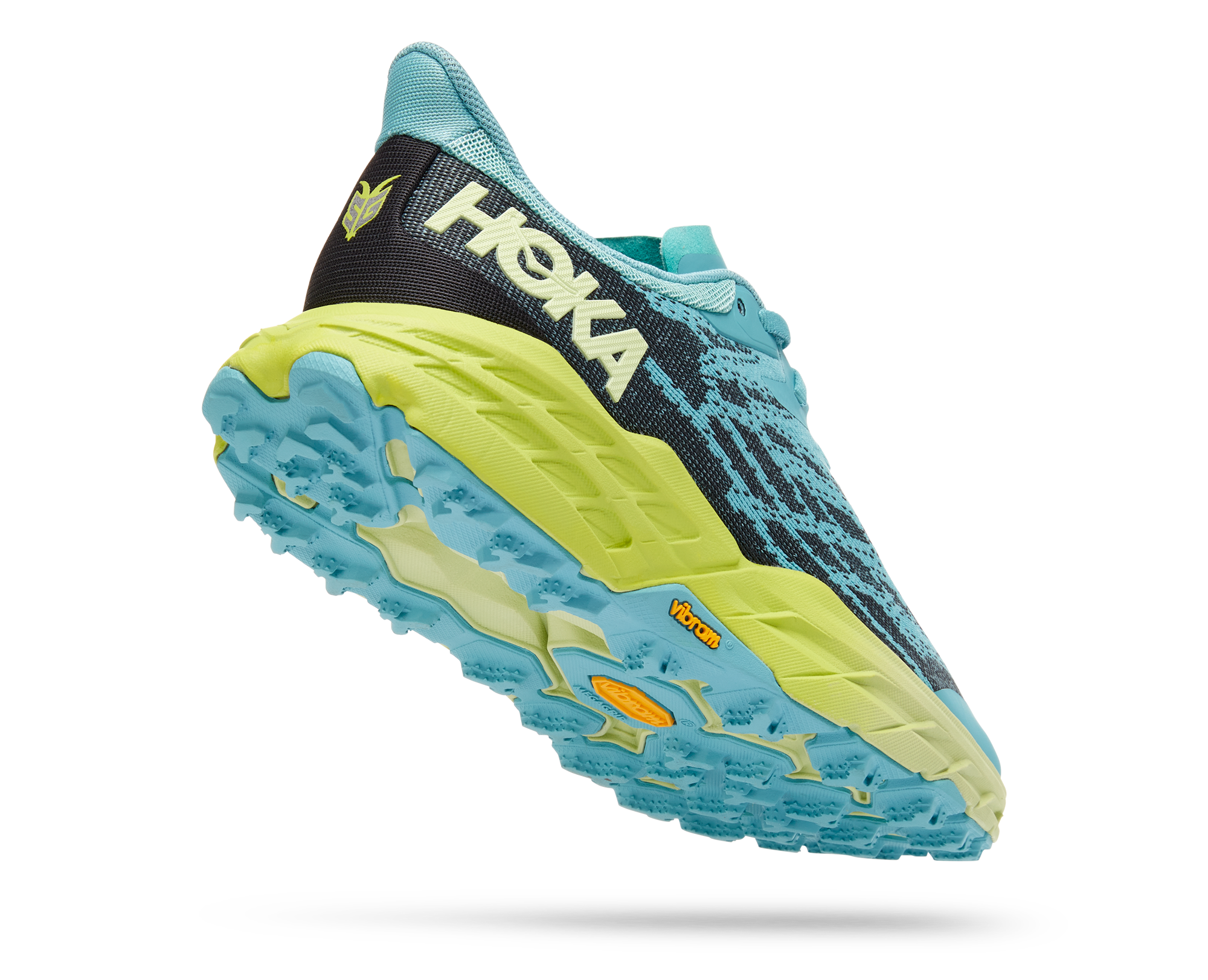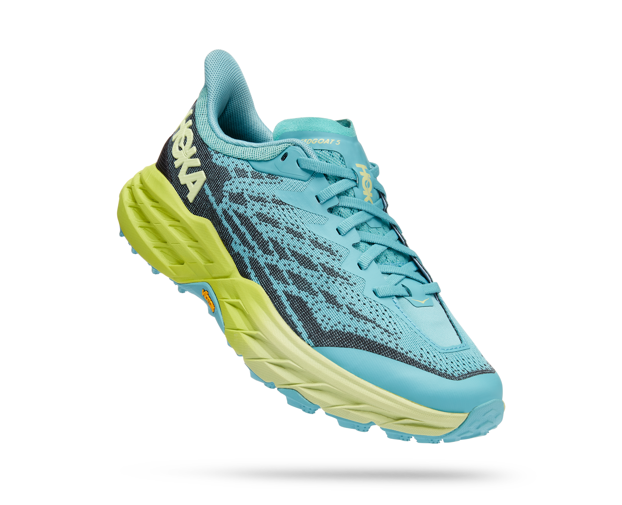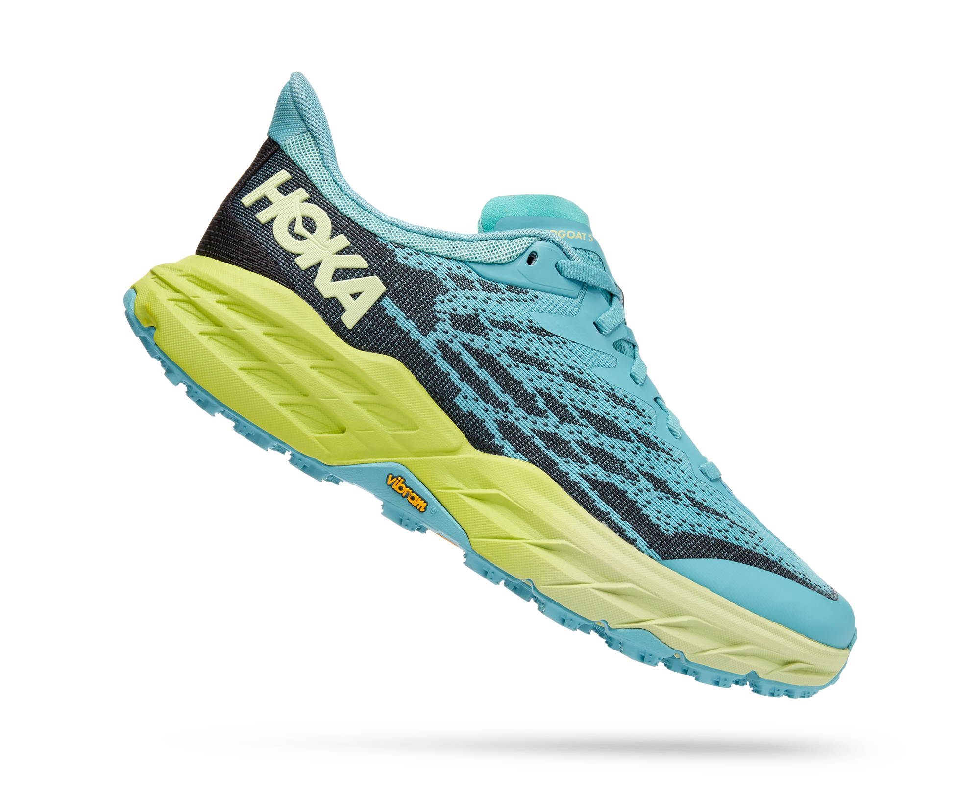 A workhorse designed for technical trails, the Speedgoat returns with less weight and more traction than ever before. A new shoe from outsole to laces, this trail beast is updated with Vibram Megagrip with Traction Lug for enhanced grip on loose soil. Retaining the same stack height and rocker profile, the Speedgoat 5 employs a lighter midsole compound and heartier, double layer jaquard mesh to inspire confidence on any terrain.